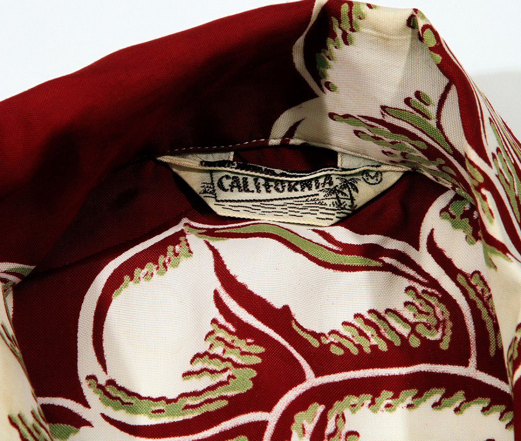 This short-sleeved aloha shirt by Made in California features stylized, hand-painted flowers and leaves in green and white, nicely complimenting the dark red fabric of the shirt. The large motifs are scattered throughout the shirt, along with tiny flowers in the same color tones. The bold pattern is a stark contrast to the intricate, Asian-inspired designs popular at the time.