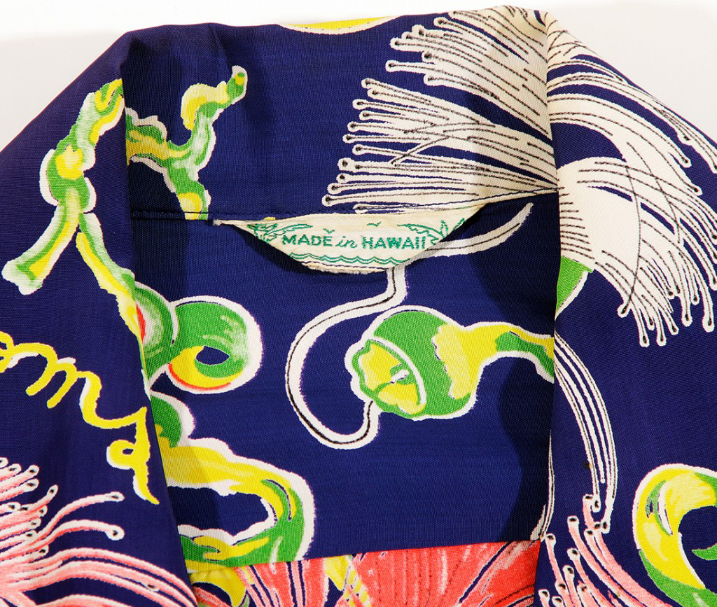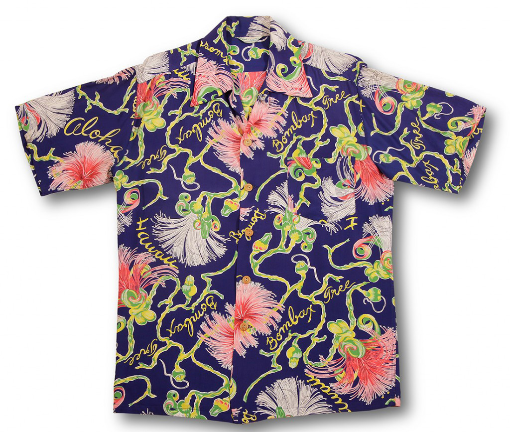 The flowers of the bombax tree bloom during the month of March in Hawaii. Their striking appearance has been likened to an exploding rocket. Designer Vera Stone Cook created this design for Kamehamea Sportswear who made both men’s and women’s garments in this stunning four way floral design. The blossoms were hand painted in their glory and combined with the words: “Aloha”, “Bombax Tree” and “Hawaii”.