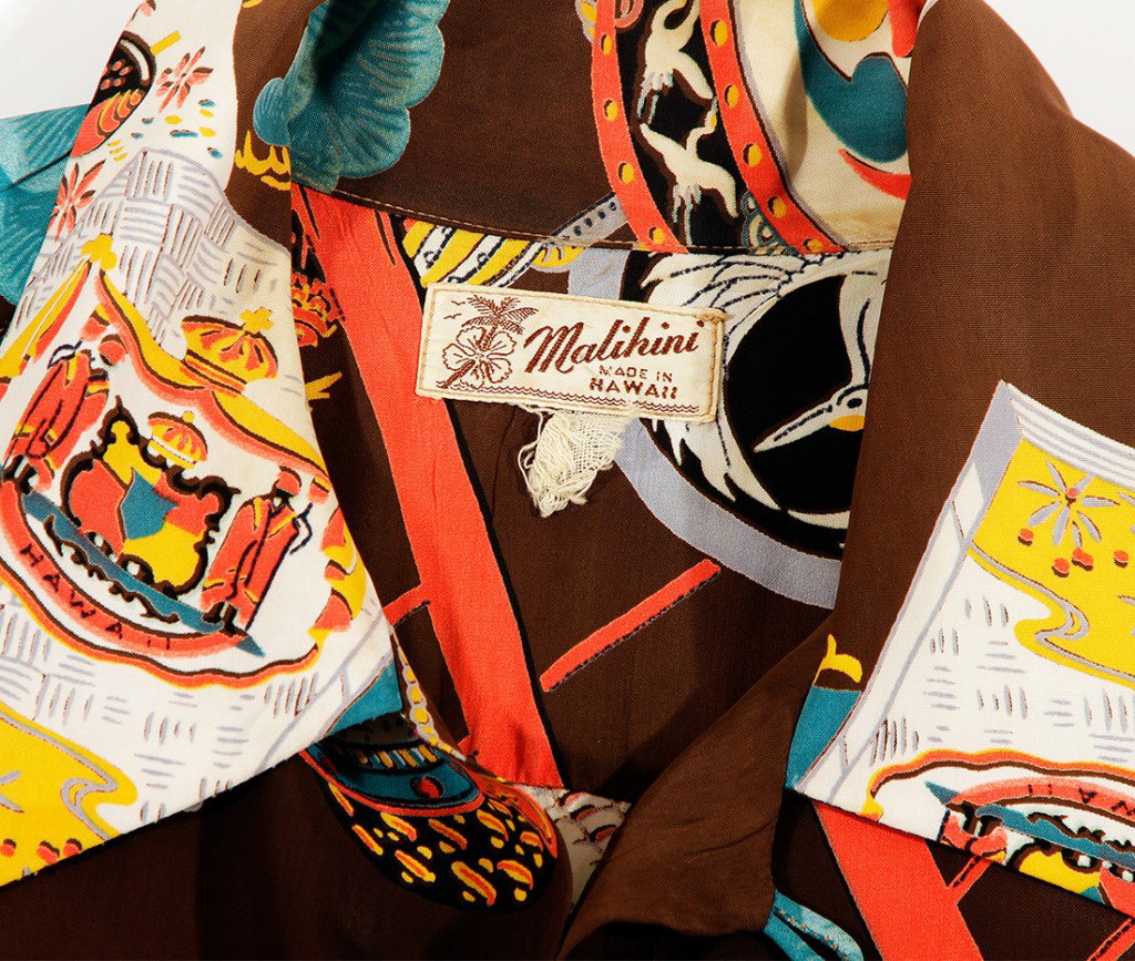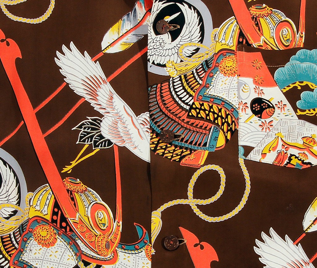 An imaginative design, this short-sleeved Malihini aloha shirt features two prominent symbols in Japanese culture.