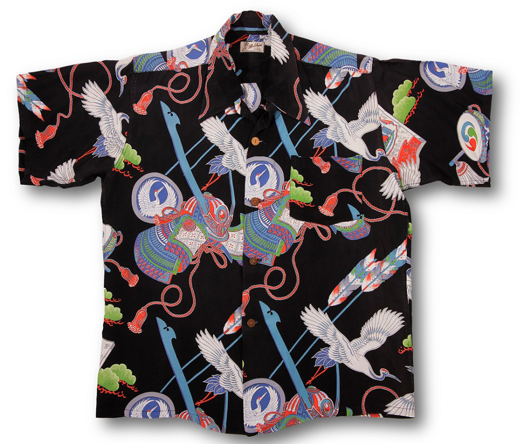 An imaginative design, this short-sleeved Malihini aloha shirt features two prominent symbols in Japanese culture.