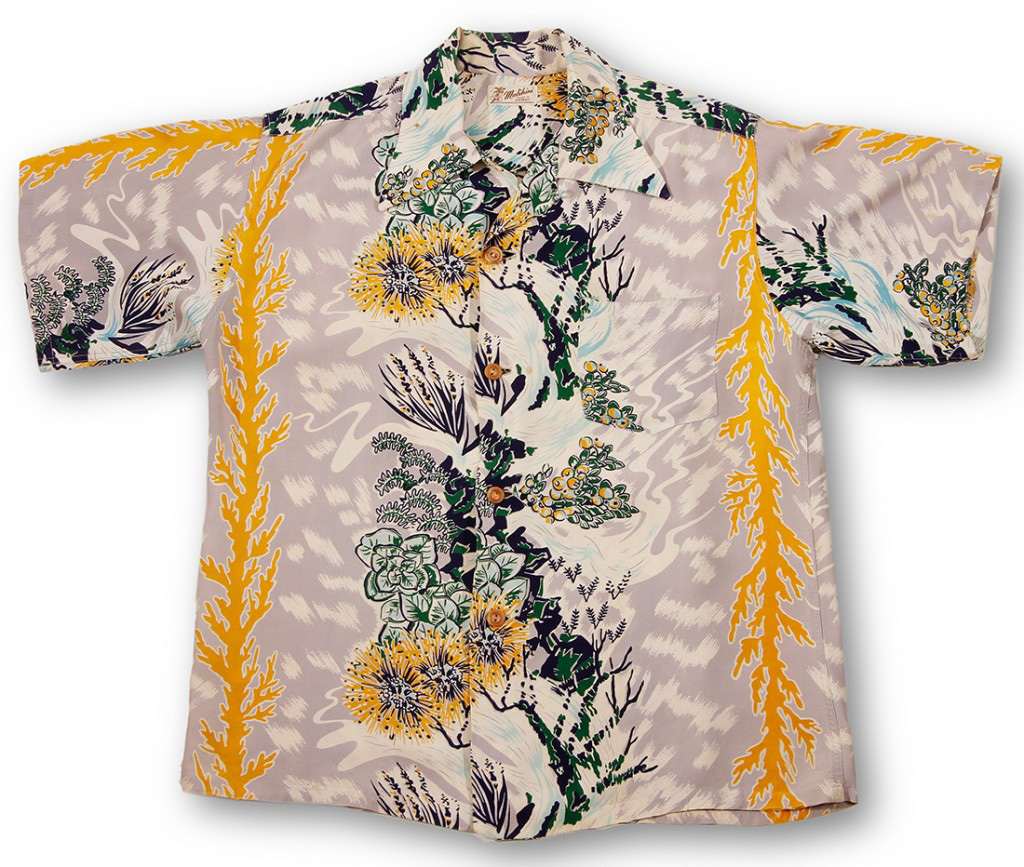This gorgeous aloha shirt by Malihini showcases the native plants of Hawai‘i. Taking center stage are two beloved native plants: the ʻōhiʻa lehua and ʻōhelo.