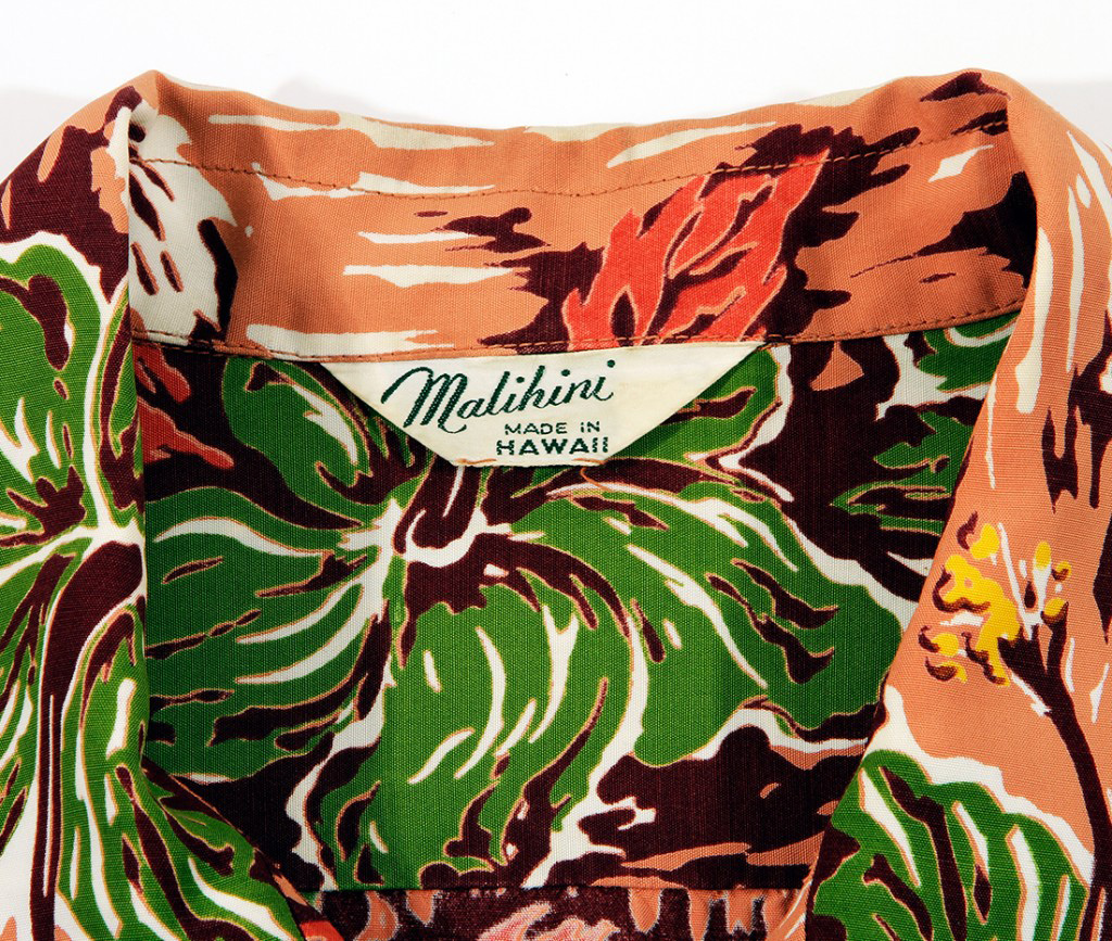 Like a painting on a piece of driftwood, this short-sleeved aloha shirt by Malihini features olive green hibiscus flowers on a textured orange fabric made to look like stained wood. Malihini produced both men’s and women’s garments in matching sets in the same prints. It’s easy to imagine a matching dress to this lovely design.