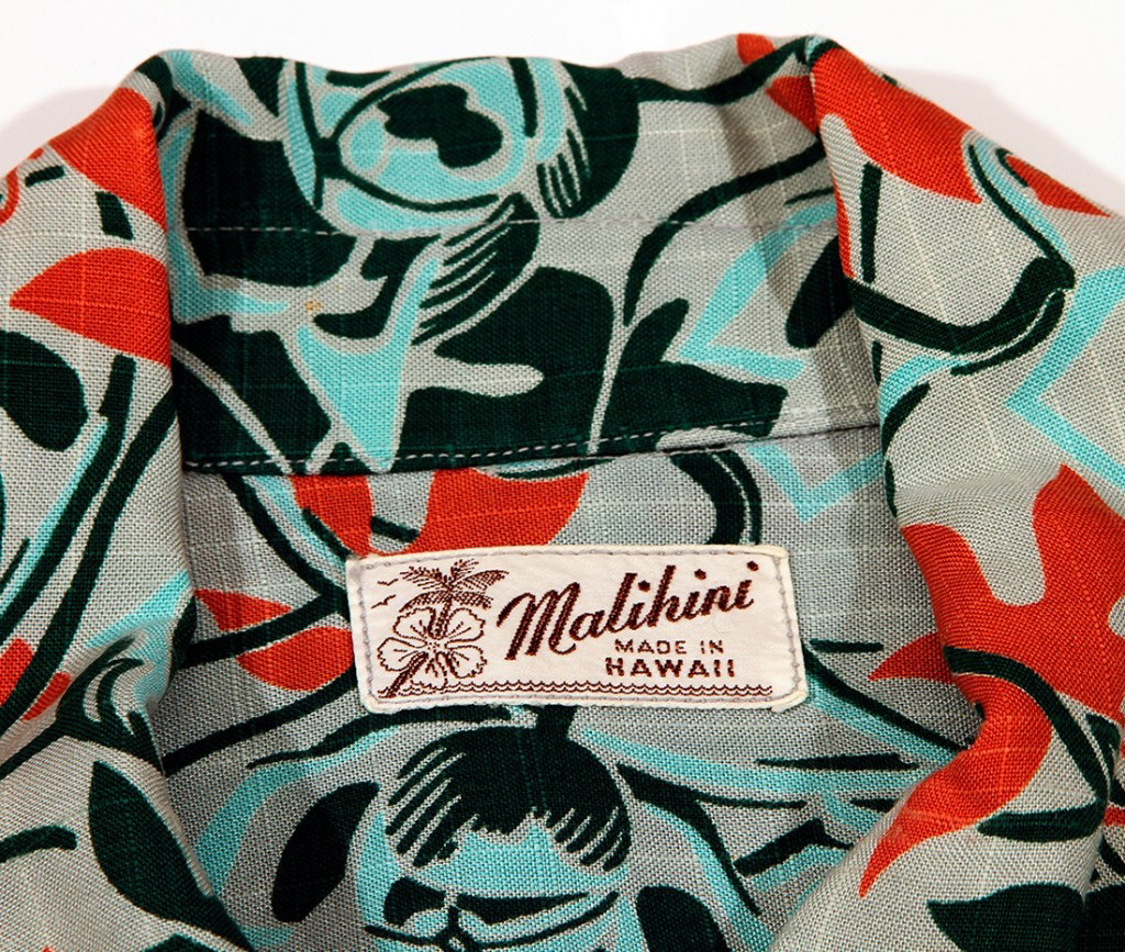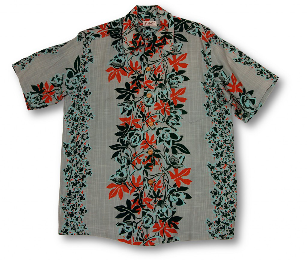 Various red and black leaves flow vertically down the middle of this gray, short-sleeved aloha shirt by Malihini. The leaves are intertwined with floral vines. Along the sides run clusters of small black, aqua and red flowers, complimenting the larger motifs on the shirt. The color combinations make this an aloha shirt that can be worn to the office or a sunset dinner at the Halekulani.