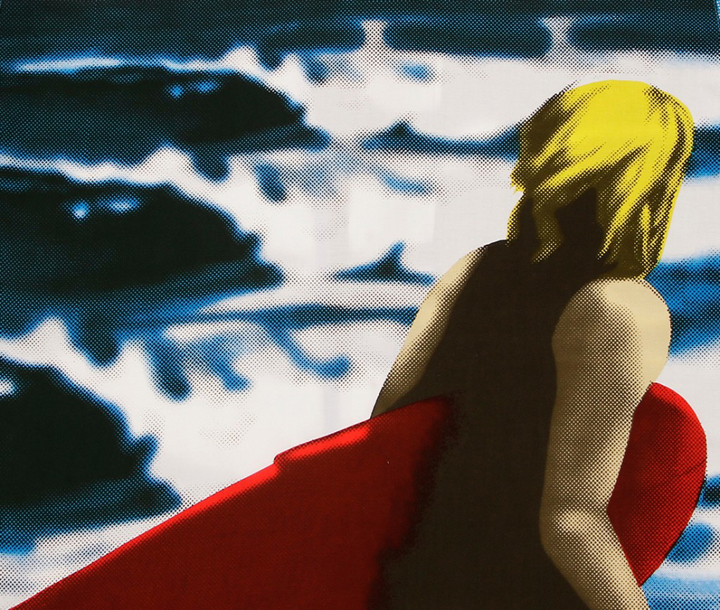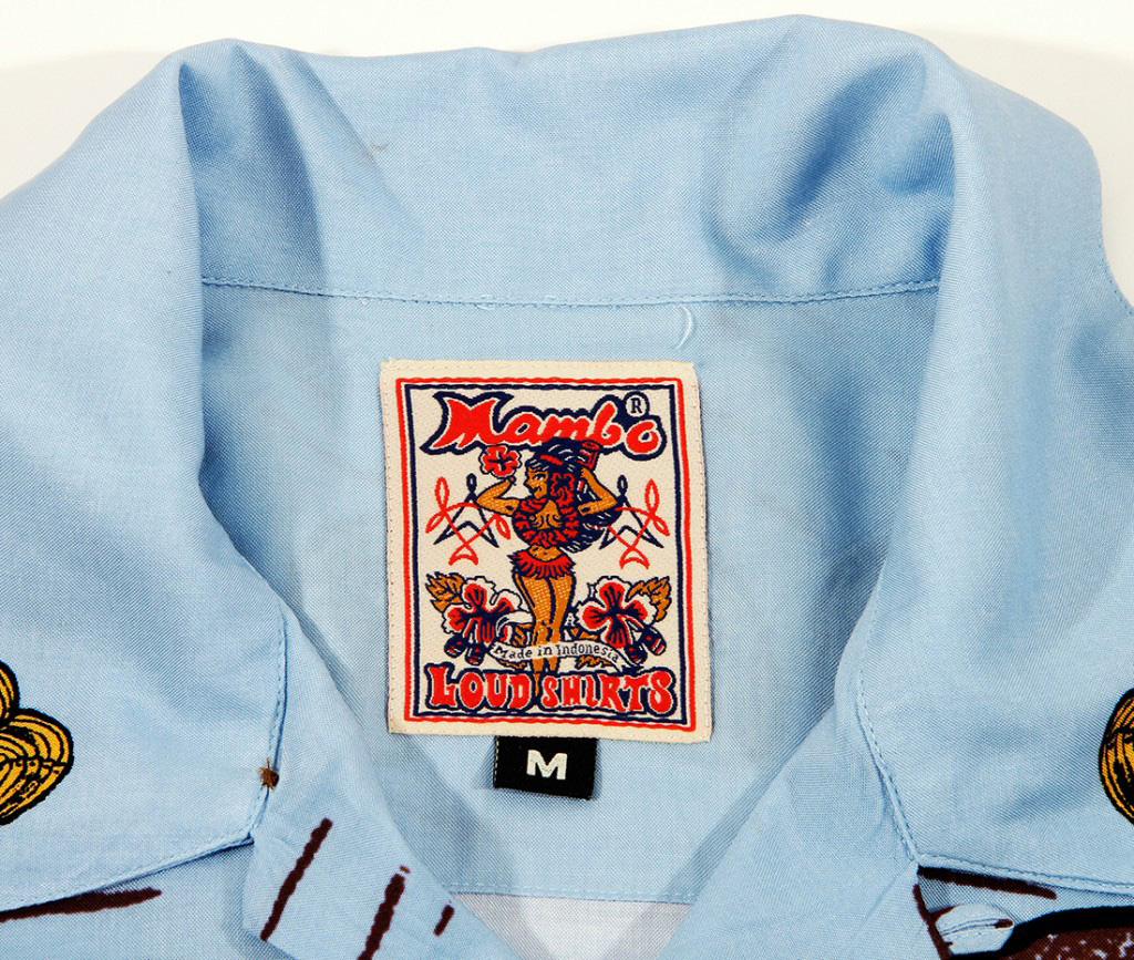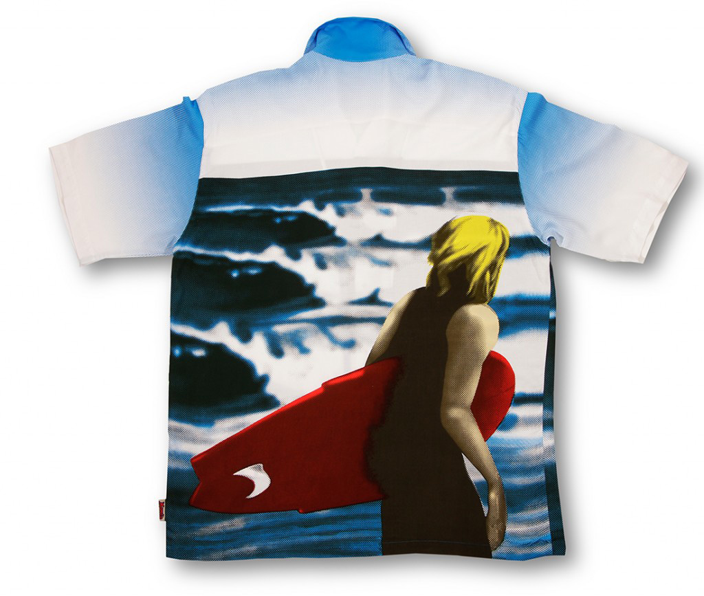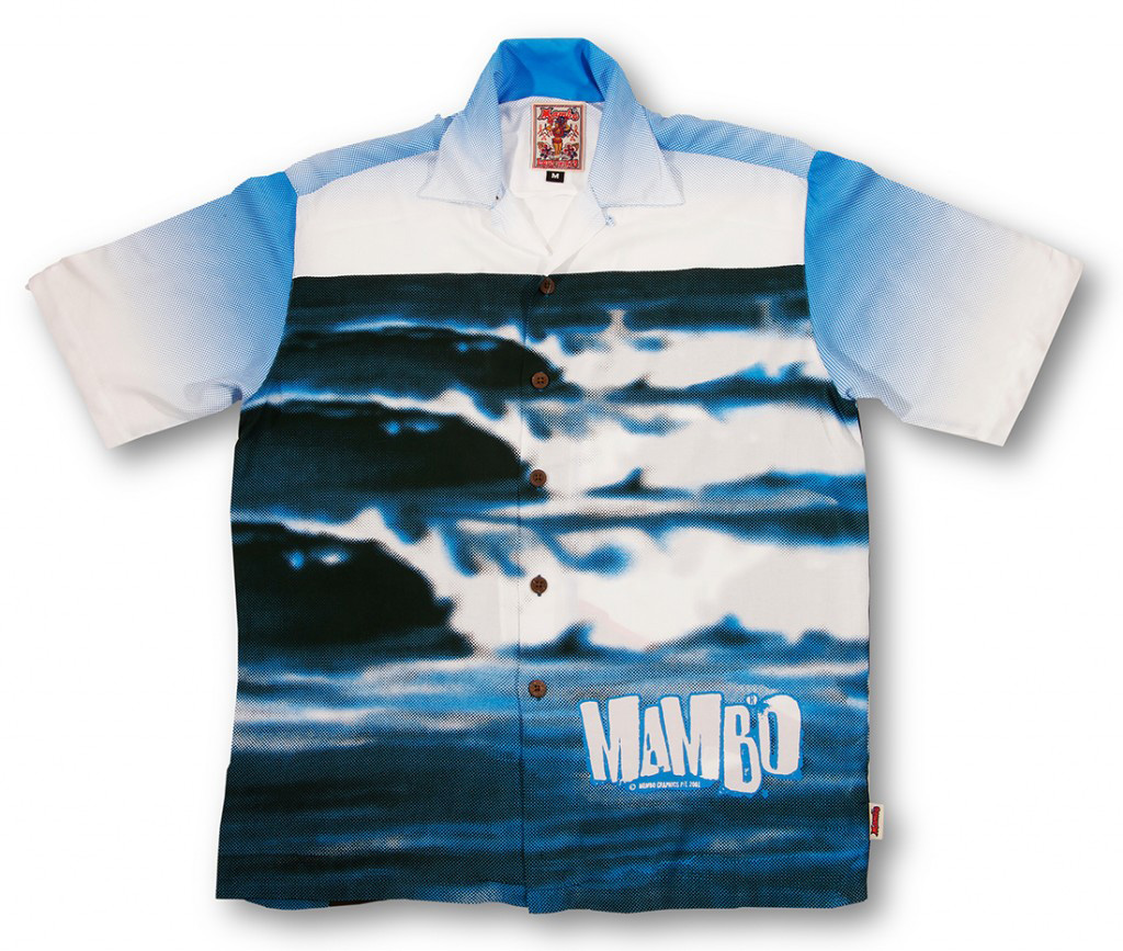 A rare aloha shirt by Mambo Loud Shirts that actually could be about Hawai‘i. The front of the shirt is a photograph of a three-set wave rolling into shore, the whitewash crashing in a perfect sequence. This could be anywhere — O‘ahu’s North Shore or somewhere in California or Australia. The waves are hollow and barreling. On the back is a blond surfer in a spring suit, carrying a red single-fin retro board and walking on the beach fronting this break. He’s looking at the peeling waves — and not to judge whether or not to paddle out. You know he’s going, no matter what.