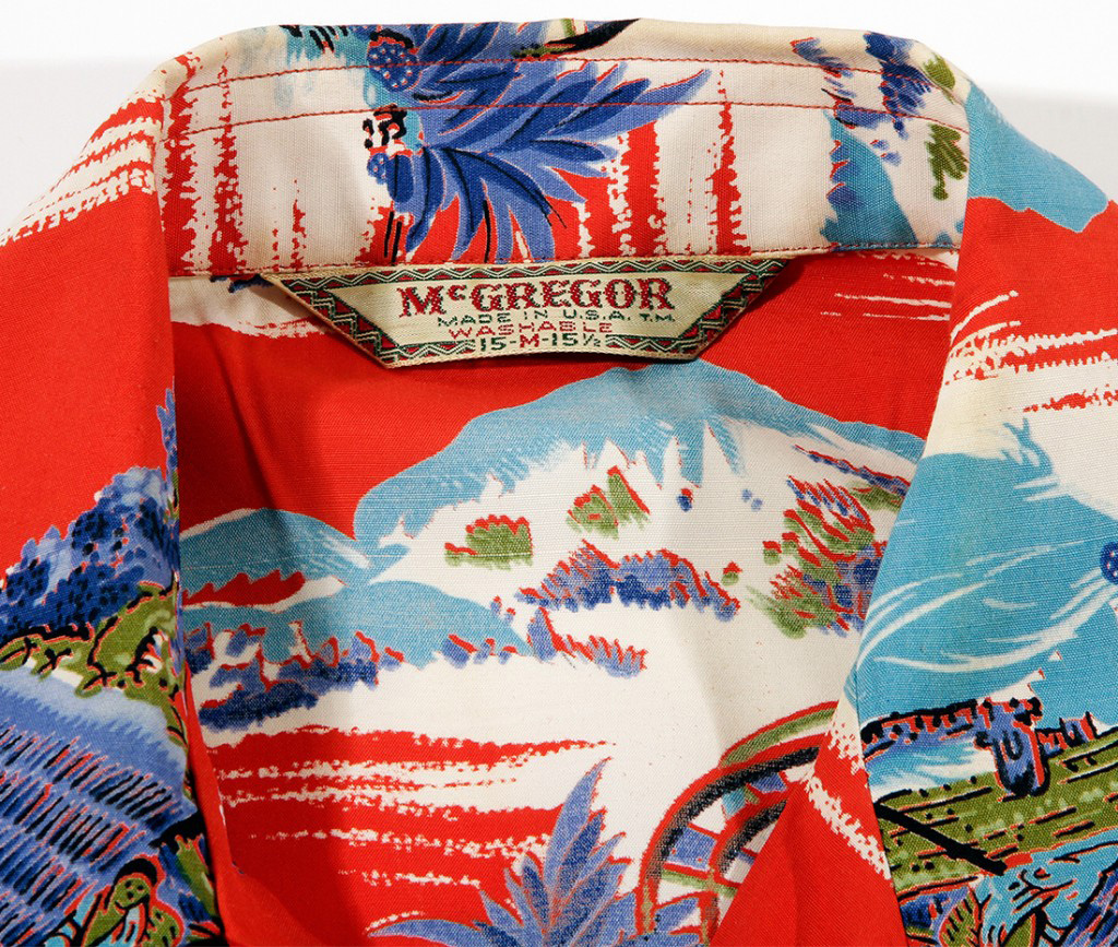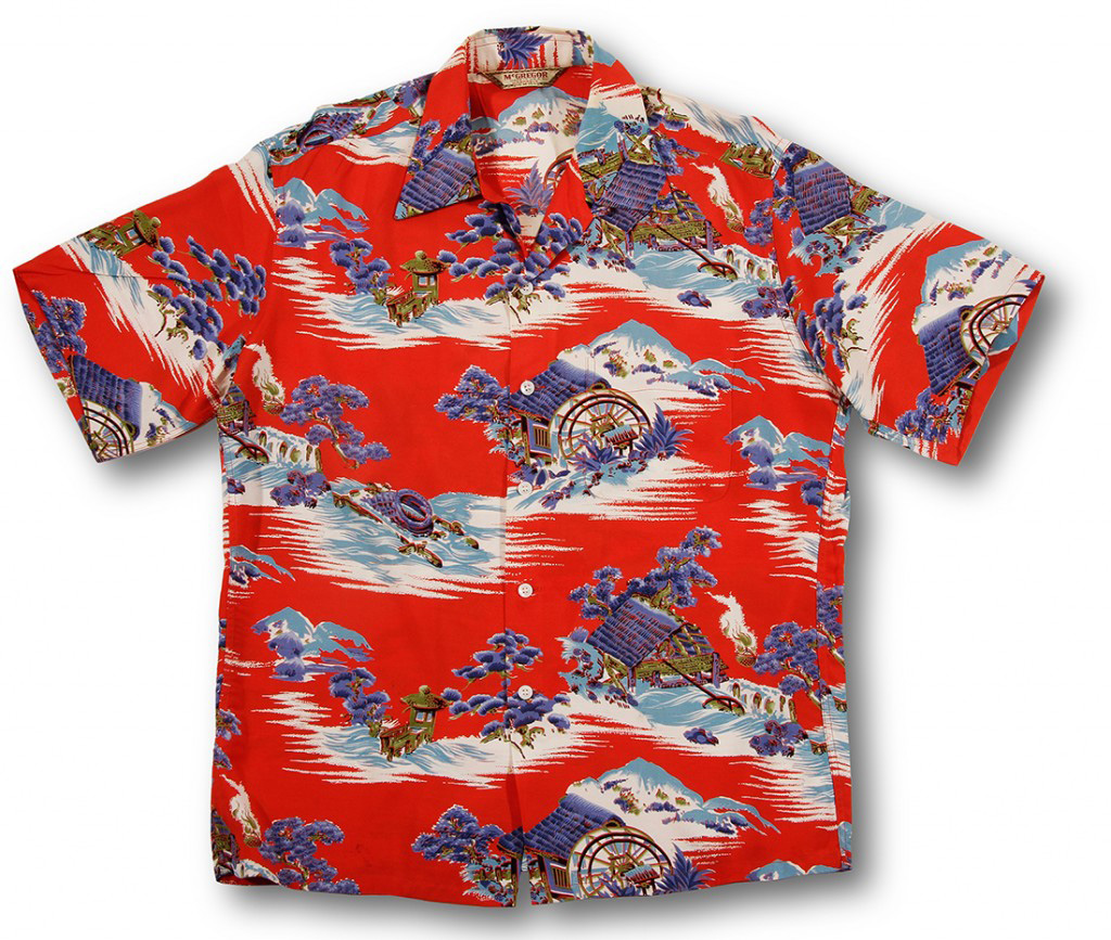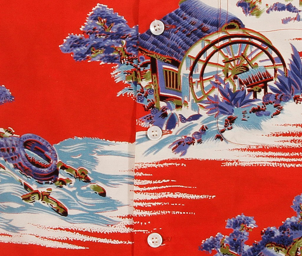 A stunning oriental Hawaiian shirt made by a mainland manufacturer with an unusual brilliant persimmon ground color. Lone eyes watch a water wheel above a fast flowing river in a mountainside wooden pole house. A fire burns near a bamboo tree near another mountain house with a large water wheel. Symbolic pine trees and background mountains surrounded by the power of water celebrate the beauty of nature in a Japanese landscape.