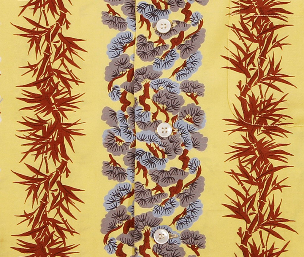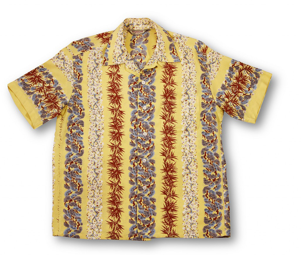 It’s Lei Day on this aloha shirt by McGregor. There are several strings of flower lei that run vertically down the front and back of this short-sleeved shirt. One is a cluster of small white flowers, another is comprised of spiky red petals. The flowers pop off the light yellow fabric of the shirt.