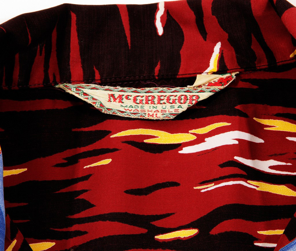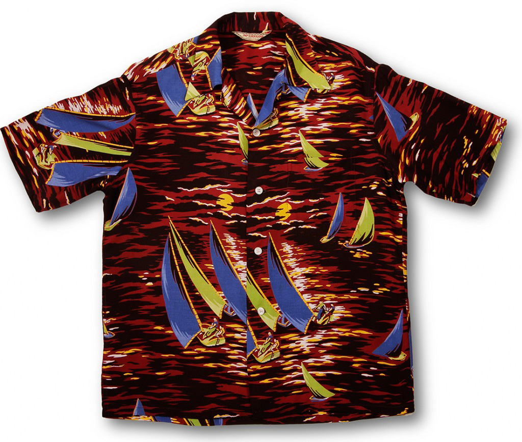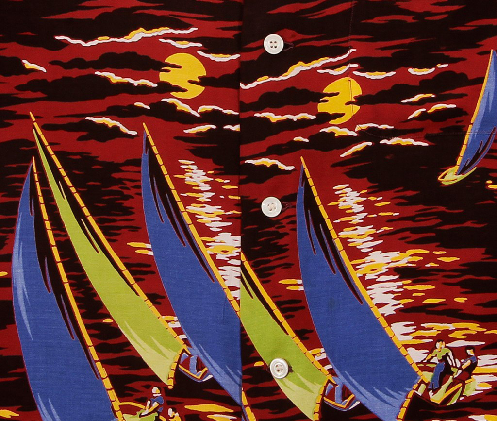 Sailboats with blue and green sails take to the open ocean on this short-sleeved aloha shirt by McGregor. Crews work to catch the winds and the last sunlight of the day. The summer sunset gives the dark red ocean a golden glow.