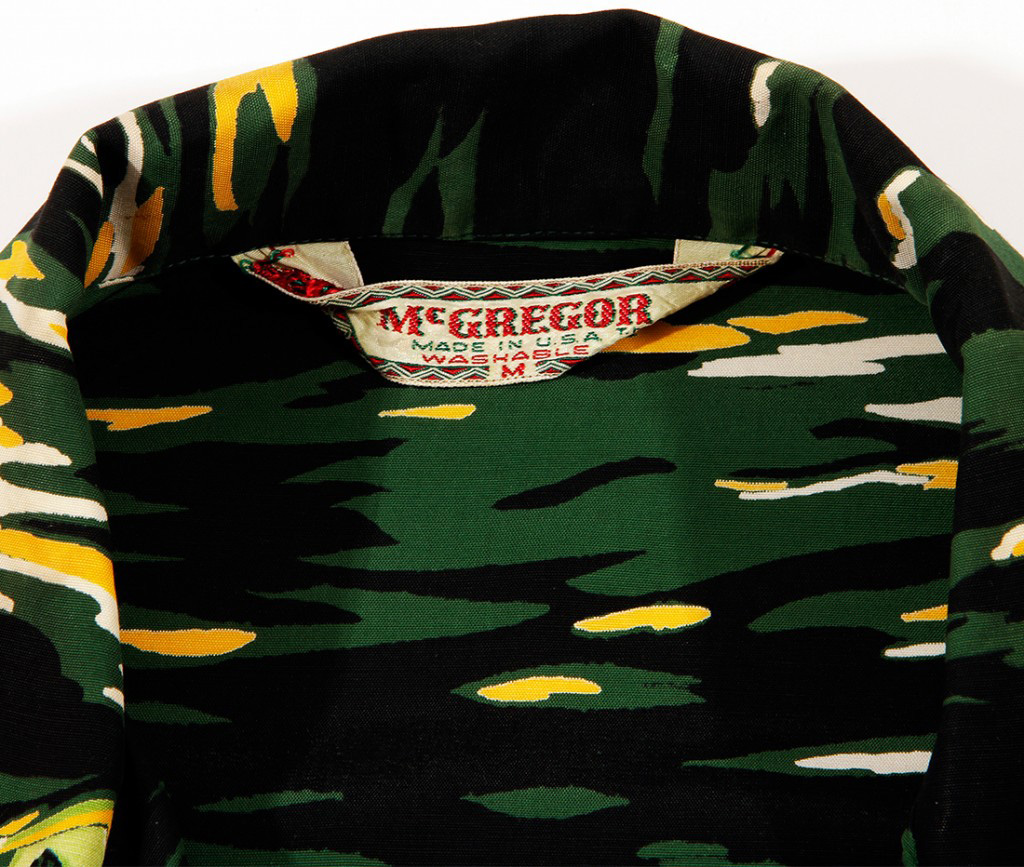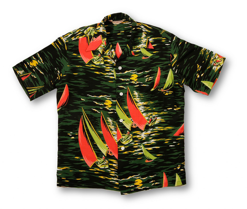 Sailboats with red and green sails take to the open ocean on this short-sleeved aloha shirt by McGregor. Crews work to catch the winds and the last sunlight of the day. The summer sunset gives the dark green ocean a golden glow.