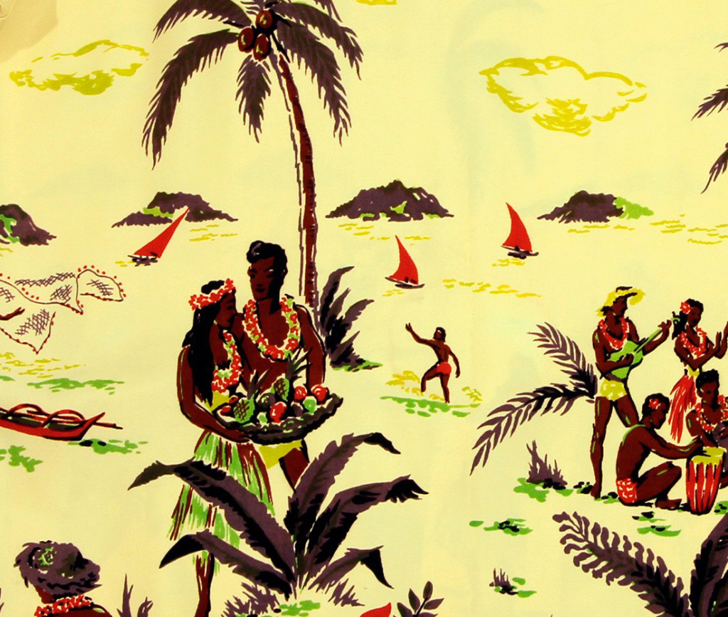 This aloha shirt by McGregor shows the ultimate lūʻau: a couple carries a tray of tropical fruits to the beach, where this party takes place. A few people kanikapila, or jam, on the beach, playing ‘ukulele or dancing hula, while sailing canoes take to the ocean.