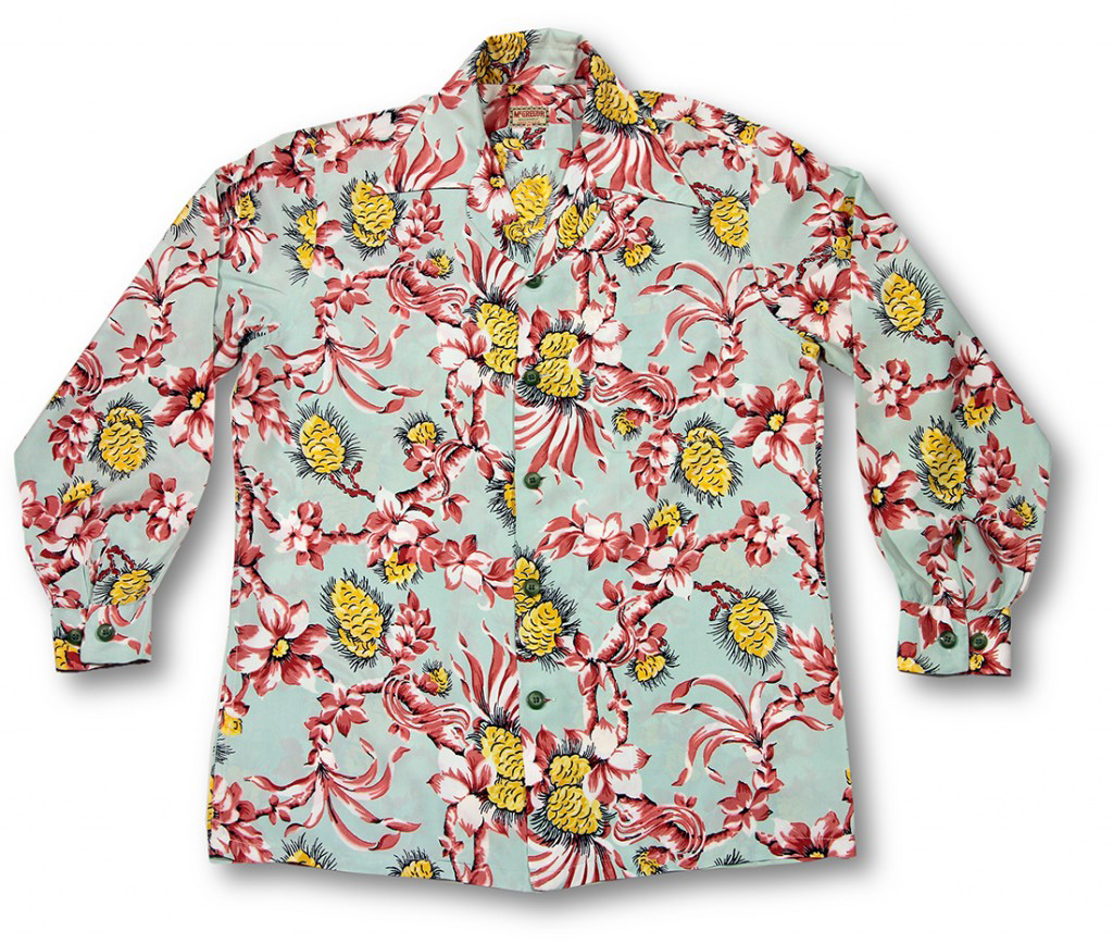 This jade-colored aloha shirt with three-quarter-length sleeves by McGregor show how a one-color, floral design can be sophisticated and interesting. Red and white flowers, big and small, wrap around this shirt, punctuated by bright yellow honeycombed fruits. The combination of colors and length of sleeves make this a shirt that can be worn for any occasion.