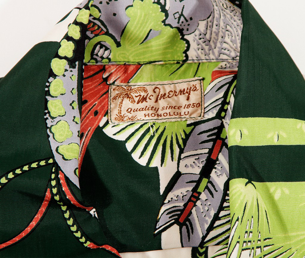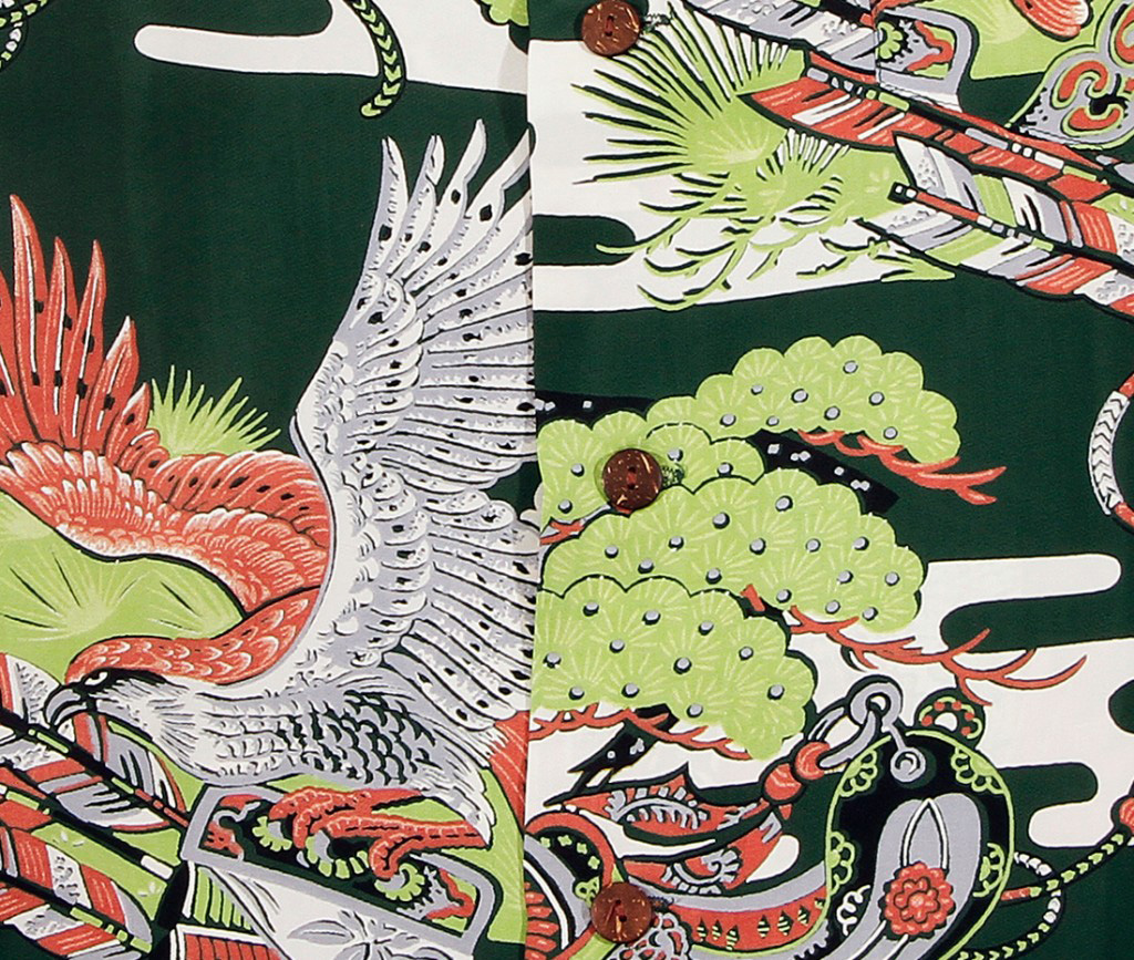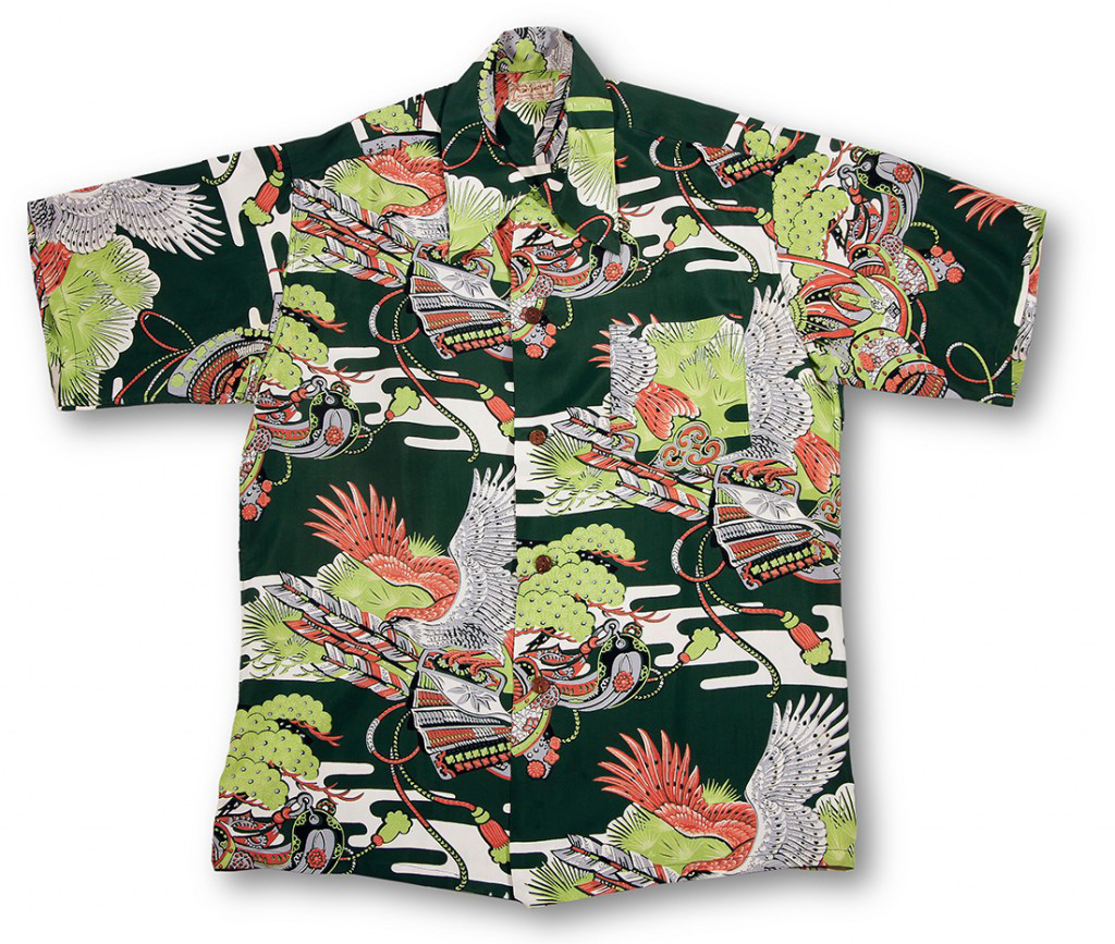 This short-sleeved vintage Hawaiian shirt by McInerny’s showcases the Asian-inspired motifs popular at the time. The main theme here is kyudo, the Japanese martial art of archery, which originated with the samurai class of feudal Japan. On this shirt you see the ya, or arrows made from bamboo and the feathers of hawks or eagles. (Today, the feathers come from non-endangered birds such as turkeys or swans.) This art was often used performed on horseback. Soaring across the shirt is a bird from which the ya feathers came. The light green pines and trees give this scene a sense of place.