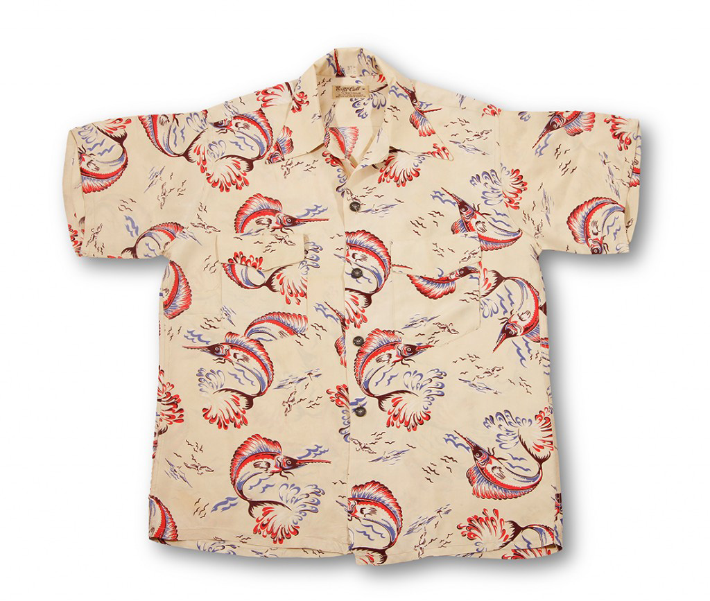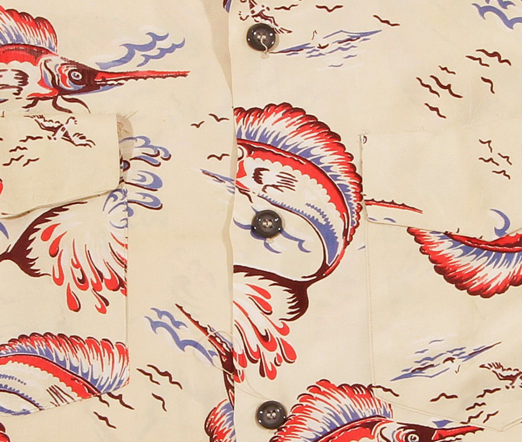 One of the most prized deep-sea fish in Hawai‘i is the Pacific blue marlin (kajiki in Japanese or a‘u in Hawaiian). It’s got a larger size, heavier bill and rougher skin. These fish, which are line-caught from trolling boats and longliners, can get as large as 1,600 pounds in round weight. This cream McCall vintage Hawaiian shirt features the Pacific blue marlin prominently, its dorsal fin red and purple. This sportswear-maker was known for its two-way collar and twin pockets.