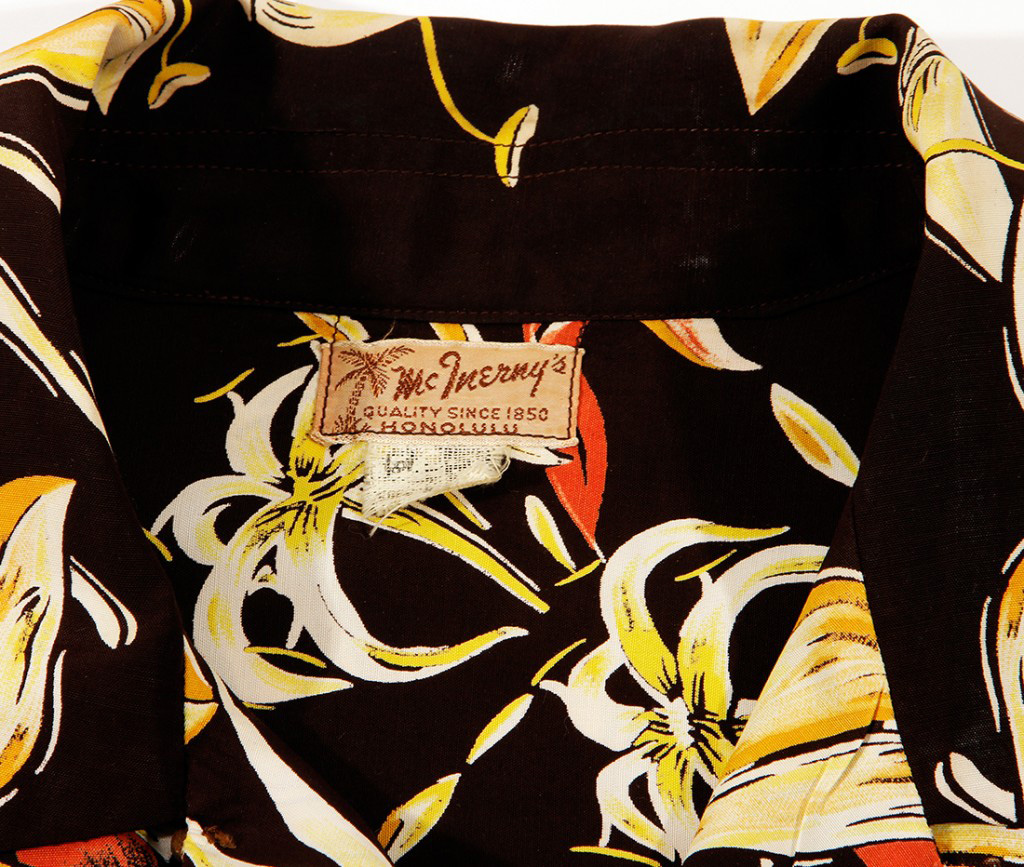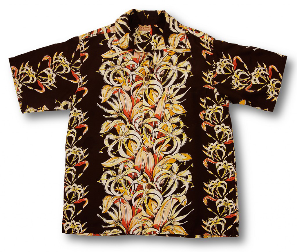 This short-sleeved aloha shirt by McInerny’s features the kahili ginger (Hedychium gardnerianum), a plant native to the Himalayas in India, Nepal and Bhutan but found everywhere in Hawai‘i. It got its name from its appearance: kahili, in Hawaiian, is a feather standard or long pole decorated at one end with a cluster of feather plumes. It’s long been a symbol of royalty. This plant was introduced to the Islands from eastern India because of its ornamental value in the early 19th century. But since then — and despite its beauty and fragrant pale yellow flowers — it’s considered one of the worst invasive species in the world.