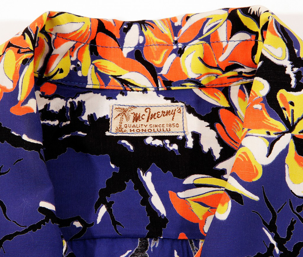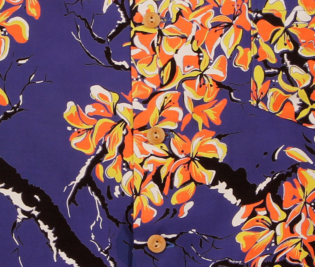 An interesting pattern, this short-sleeved aloha shirt by McInerny’s features clusters of orange and yellow flowers on a tree at twilight. The limbs of the tree are black, the sky a deep purple, the night clear and quiet.