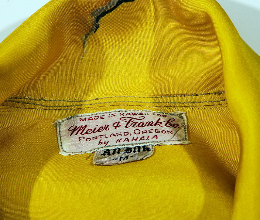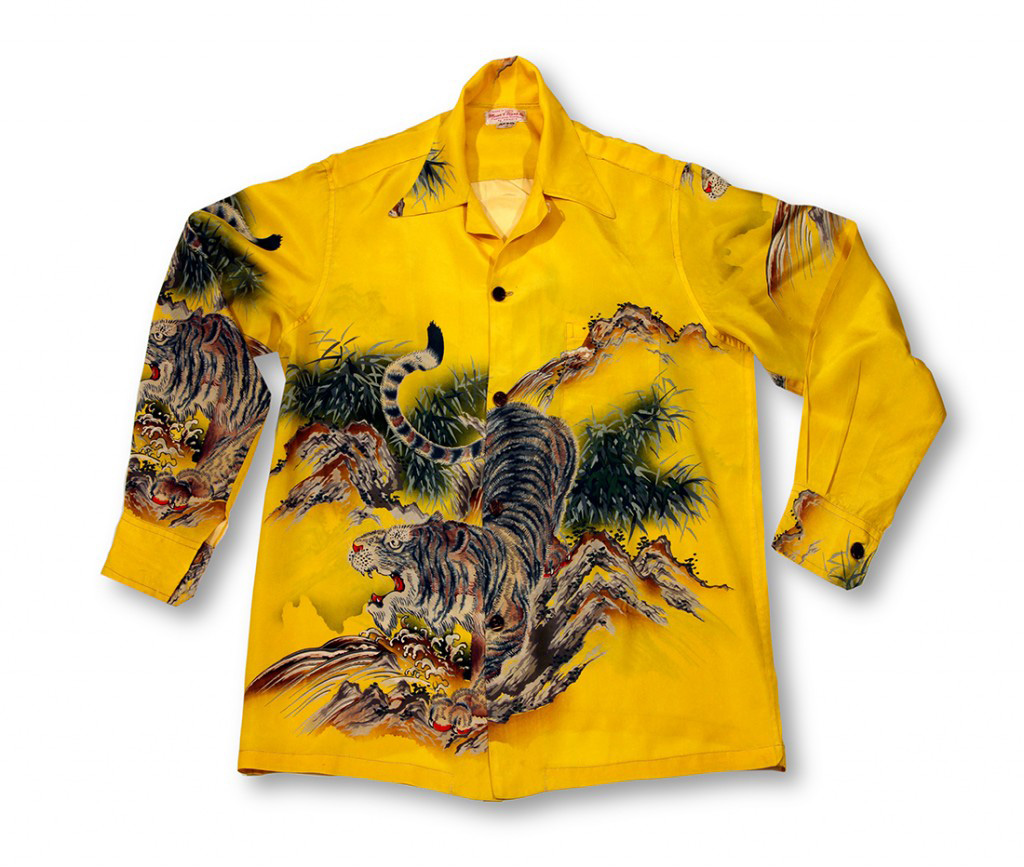 This long-sleeved vintage Hawaiian shirt by Meier & Frank pays homage to the tiger, a fierce symbol of strength and ferocity in Asian cultures. The angered tiger moves with purpose across the stark landscape, his powerful paws crushing the earth. This Asian-inspired motif was popular during this era.