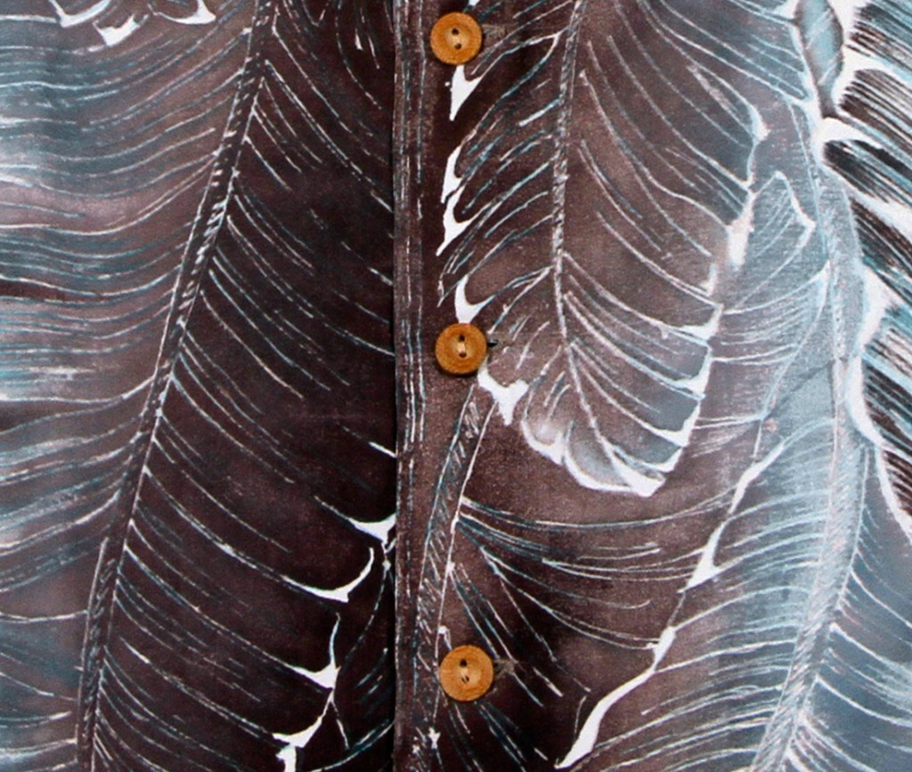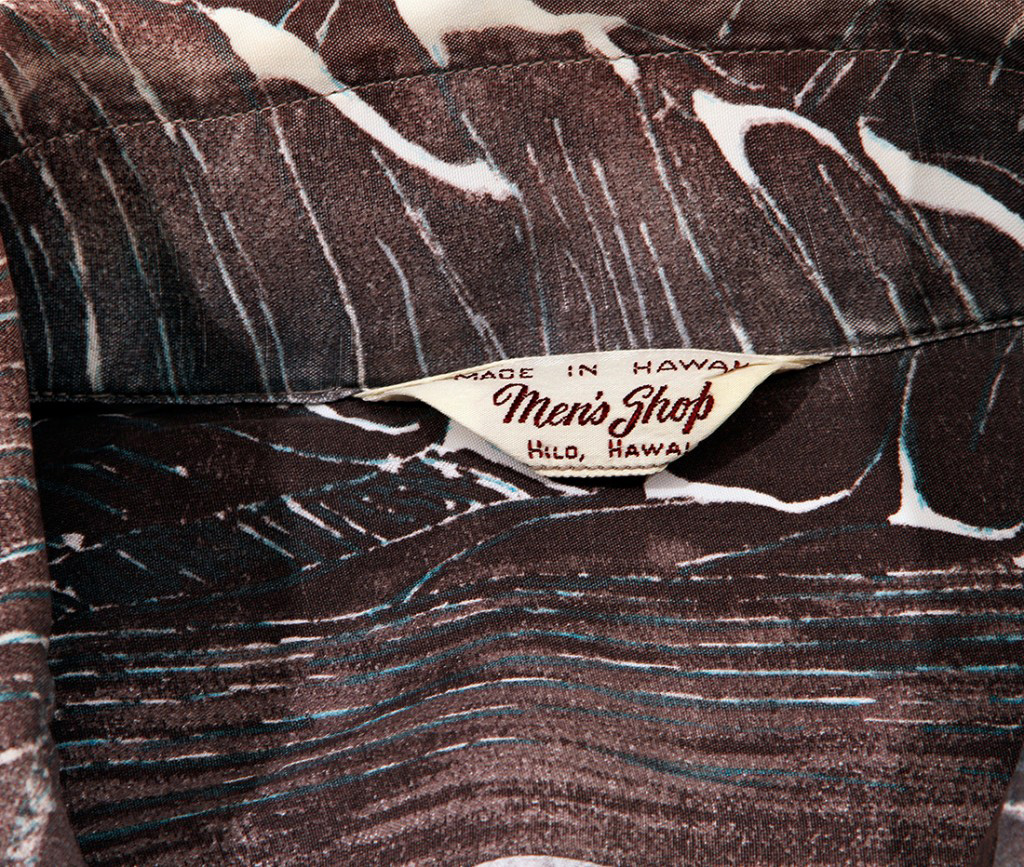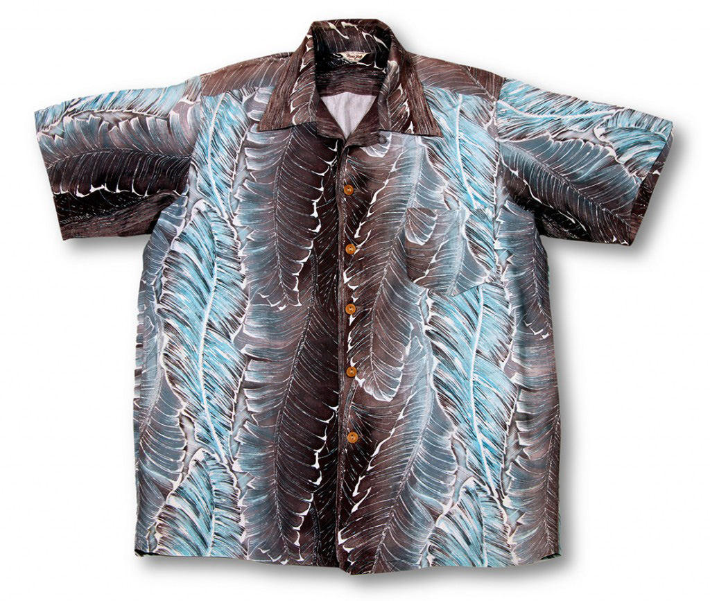 A latecomer to the vintage Hawaiian shirt scene, Hilo-based Men’s Shop created this short-sleeved aloha shirt, capturing the colors and vibe of the Big Island. The entire shirt is patterned in long leaves, the colors a blend of dark earthy brown to the light aqua of the ocean.