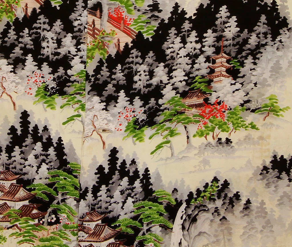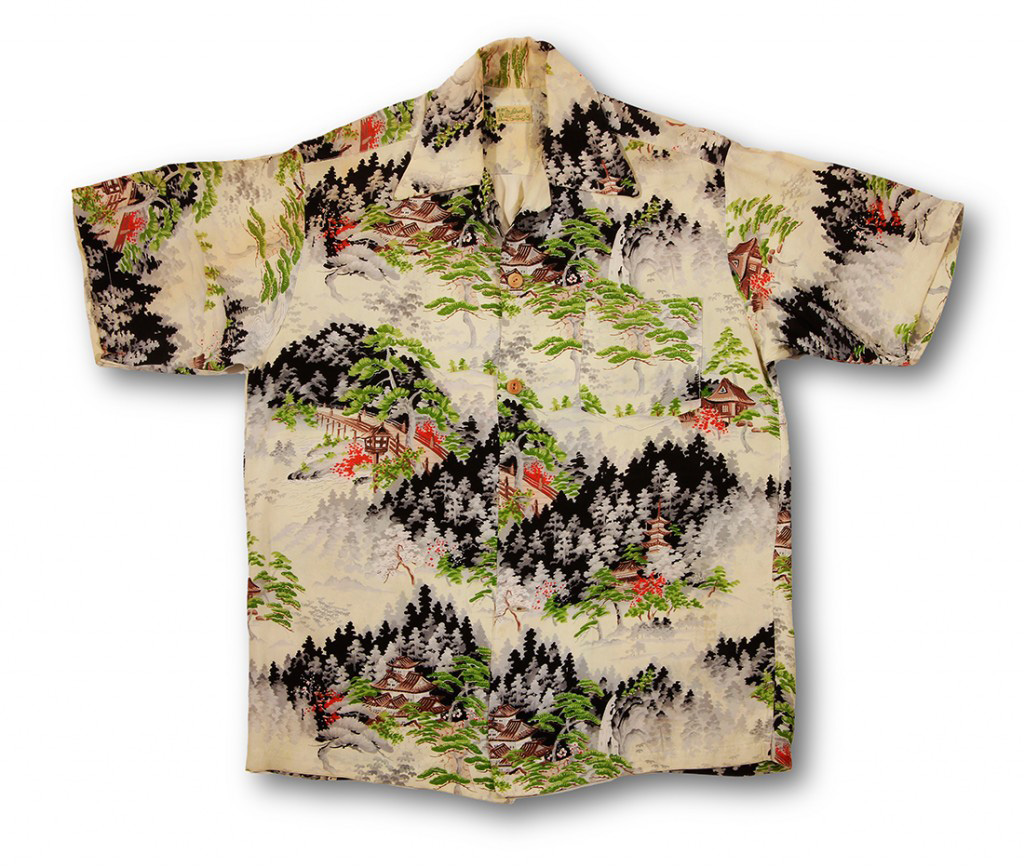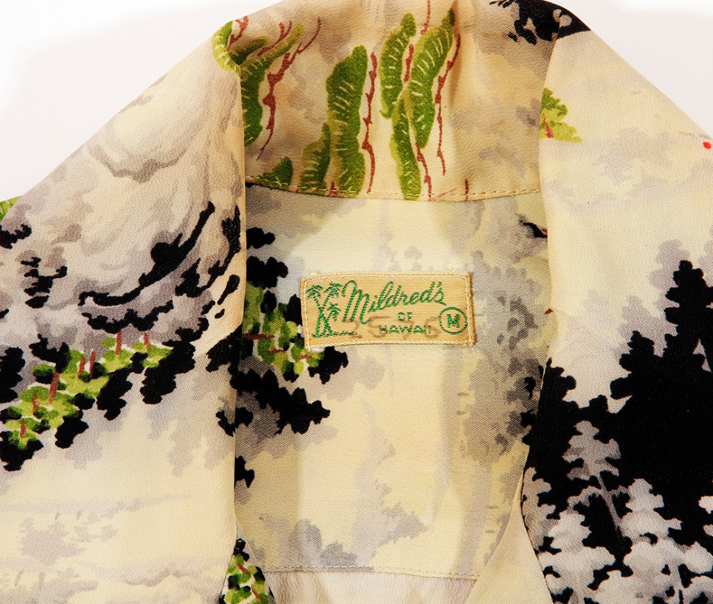 A lone road meanders through a mountain village on this short-sleeved vintage Hawaiian shirt by Mildred’s of Hawaii. The road starts from a small village in the hillside, only the roofs of the houses exposed above the tall trees and pines surrounding them. It crosses a gorge, over a bridge, and into a forest of trees engulfed in shadows. Generously colored with many shades of each of the shirts colors, this fabric was most likely hand-painted, requiring exceptional patience and skill.