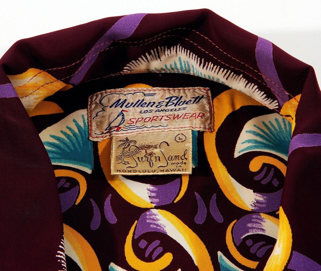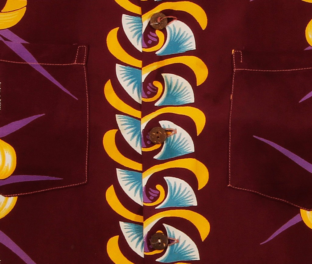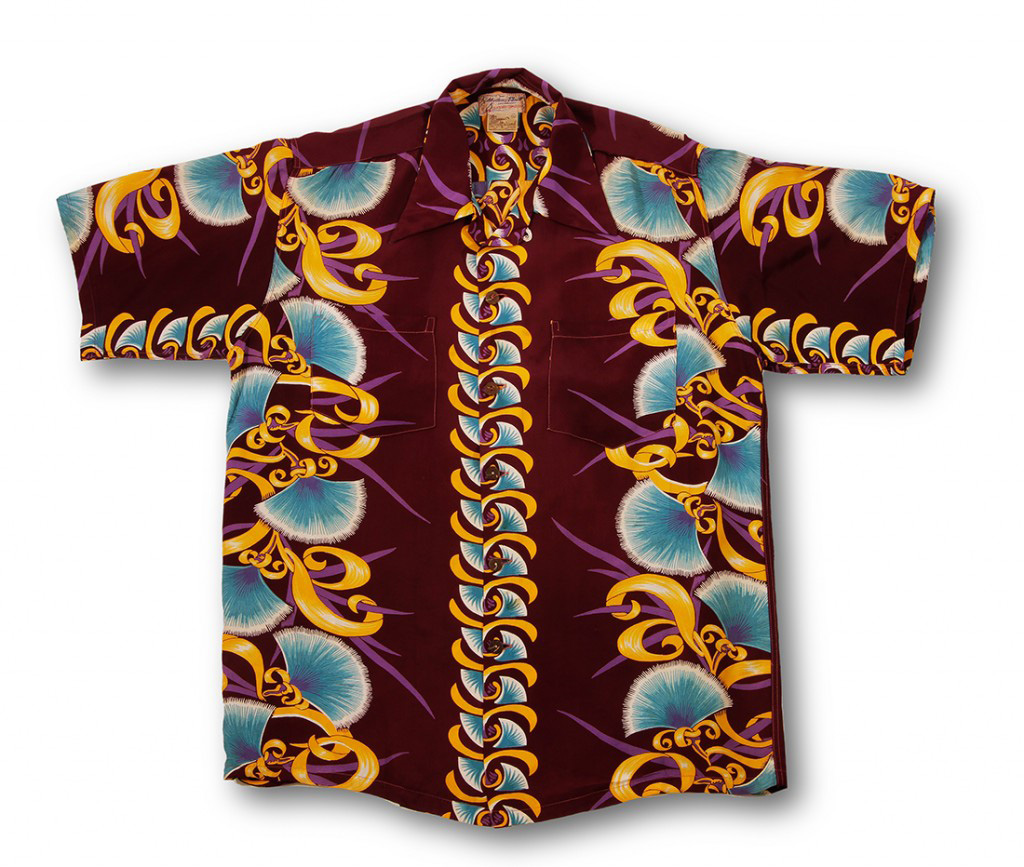 This short-sleeved, double pocket vintage Hawaiian shirt by Mullen & Bluett is a swirl of colors and patterns. On the magenta fabric pop ribbons of gold and purple paired with turquoise fans, running vertically down the middle and sides of this shirt. The motifs aren’t Hawaiian, per se, but the cut and style of the aloha shirt is definitely in the genre.