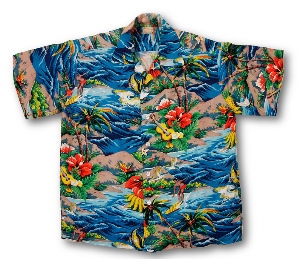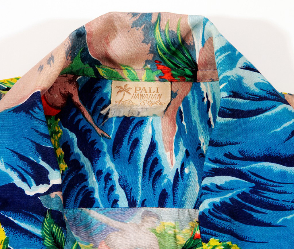 Paradise is depicted in this short-sleeved kabe crepe vintage Hawaiian shirt by Pali Hawaiian Style. The deep blue ocean swells ebb and flow along a sandy beach with coconut trees and tropical flowers like hibiscus and anthuriums. A surfer glides on his longboard in the friendly waves. Kihi kihi (moorish idols) swim away from a throw net; the mālolo (flying fish) soar above the water. It’s just another perfect day in paradise.