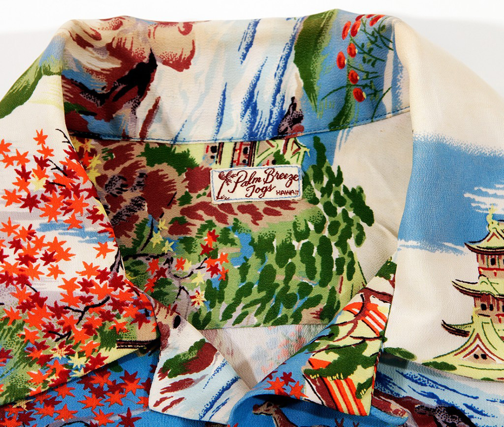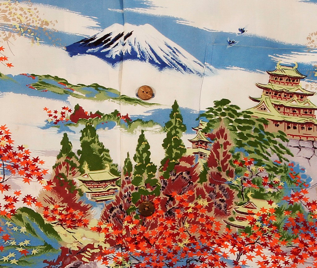 This short-sleeved aloha shirt by Palm Breeze Togs is nod toward the Asian-inspired prints and fabrics that were popular in the ’30s, when tourism to Hawai‘i was booming. The patterns of these shirts depicted many different Asian symbols, from pine trees that represented long life to bamboo that symbolized strength with flexibility. This shirt is a postcard from Japan in the springtime. A snow-capped Mount Fuji stands majestic above the clouds, with cascading showers of red and pink sakura (cherry blossoms) in full bloom. On a hilltop is a temple with pagoda, or tiered towers, overlooking this springtime scene, with deer and birds frolicking in the new season.