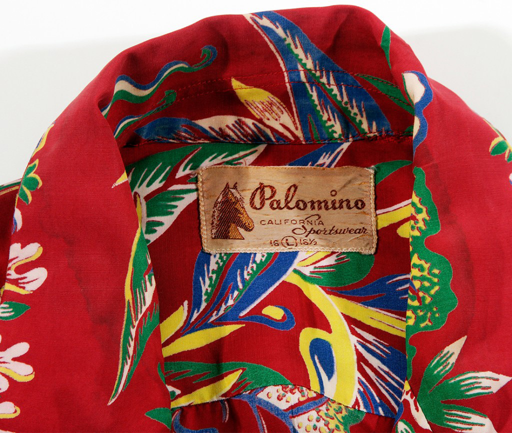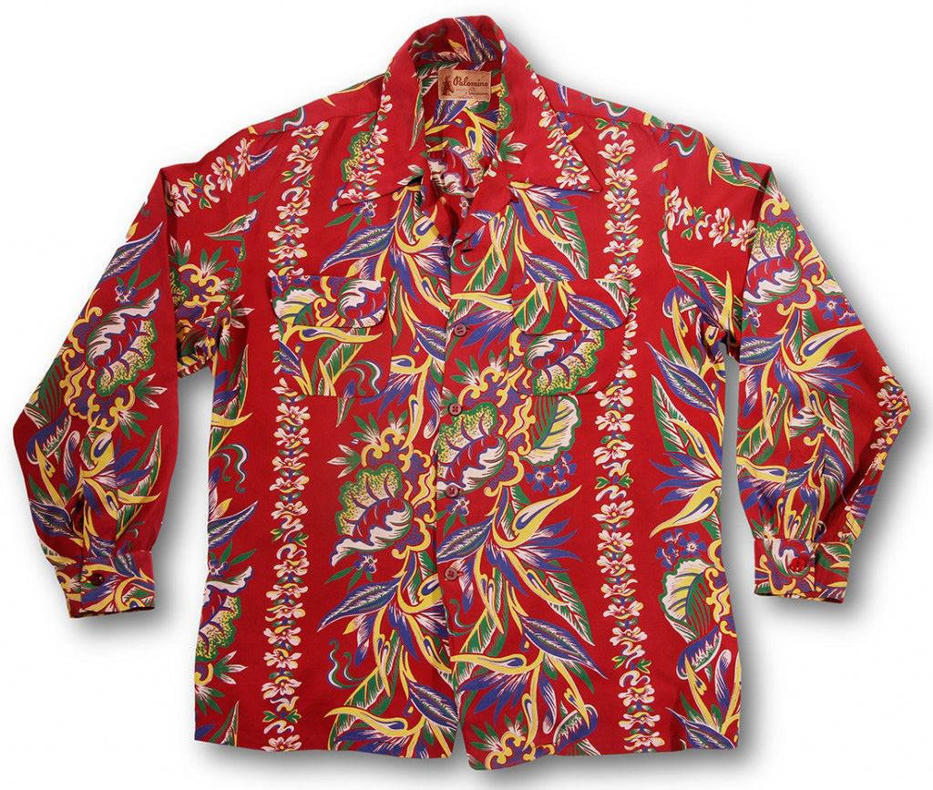 This classic vertical paneled print of exotic tropical flora is perfectly balanced with a wide panel in the center shirt front and single lei in a straight line coming off each shoulder. It’s interesting that all the beautifully rendered bird of paradise flowers are face down in the center panel. Striking red ground with butter yellow, royal blue, leaf green all work well together for this vintage, double flap pocketed, long sleeved evening Hawaiian shirt.