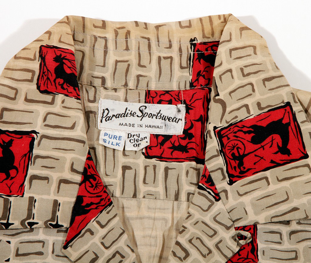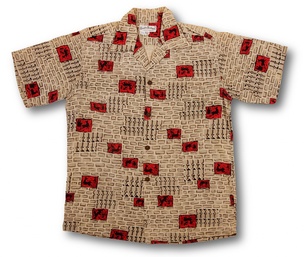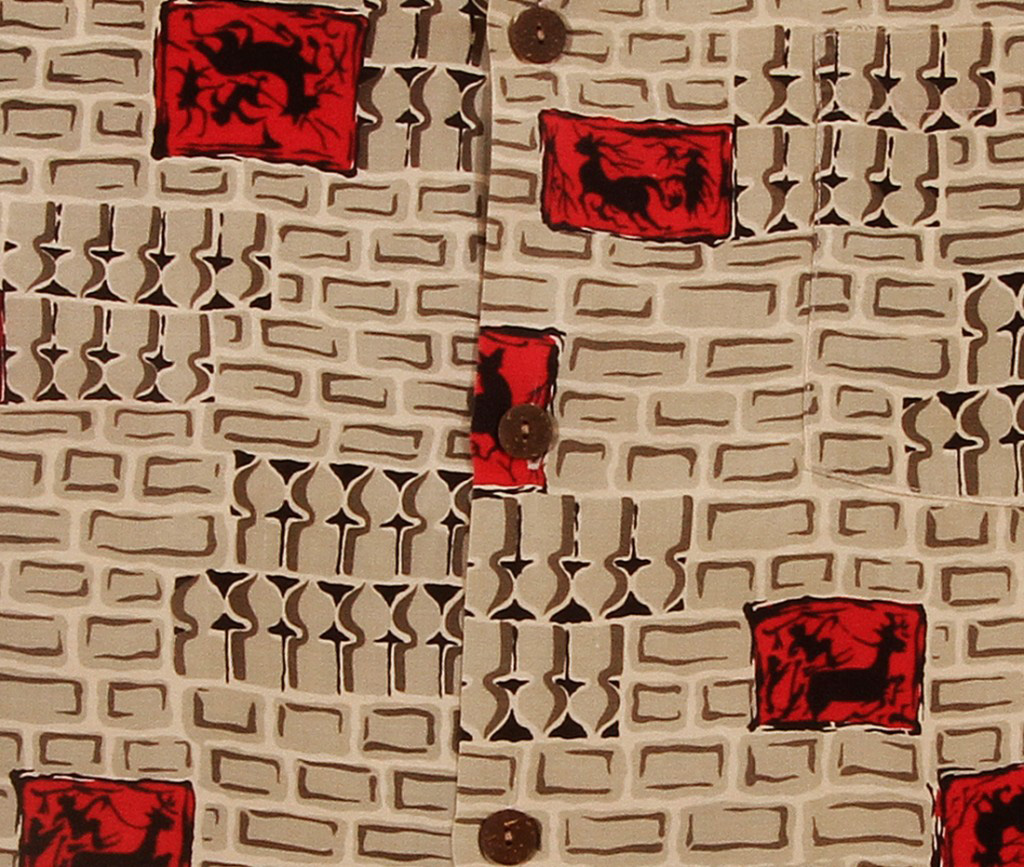 The gestures of galloping horses on matchbook like squares stand out of an abstract ground of old rock walls and interesting vertical shaped motifs. With small hints of red squares on a conservative background in shades of brown, this vintage Hawaiian shirt would have been popular with Honolulu businessmen in the 1950s.
