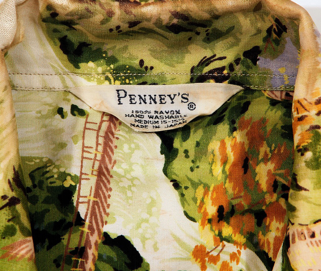 Follow the stream all the way down the valley on this Asian-inspired Penney’s vintage Hawaiian shirt. The stream meanders through mountain villages in Japan, past golden and lavender tree tops and tsuru (cranes) in flight. The water falls through gorges, under wooden bridges and past modest homes, giving you a true sense of this tranquil place.