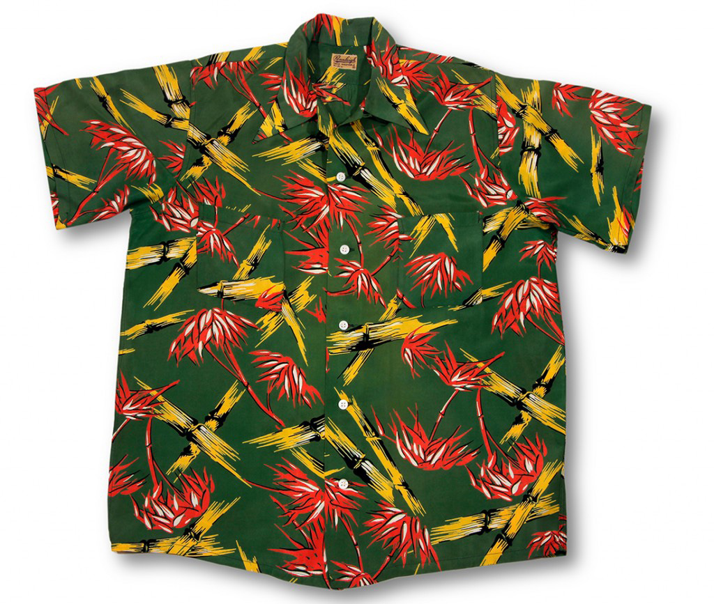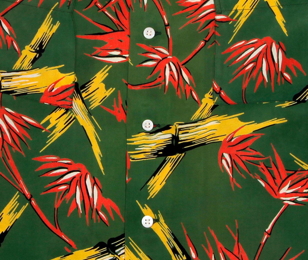 This short-sleeved vintage Hawaiian shirt by Pennleigh features a simple design of golden bamboo stalks with bright red leaves against a forest green fabric. Bamboo represents long life and strength with flexibility. The stalks cross each other, creating a dynamic pattern that makes this shirt wearable to both casual and not-so-casual events.