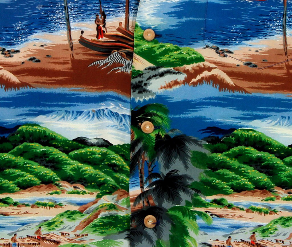 A classic design, hand-painted in Japan, with two main images of simple island life. In one, men dry their fishing nets on an uninhibited island spot. Men take cover under a oceanfront simple canoe shed with hanging fishing nets in another commanding scene. Mountains, canoes and sail boats add interest to the design in the distance.