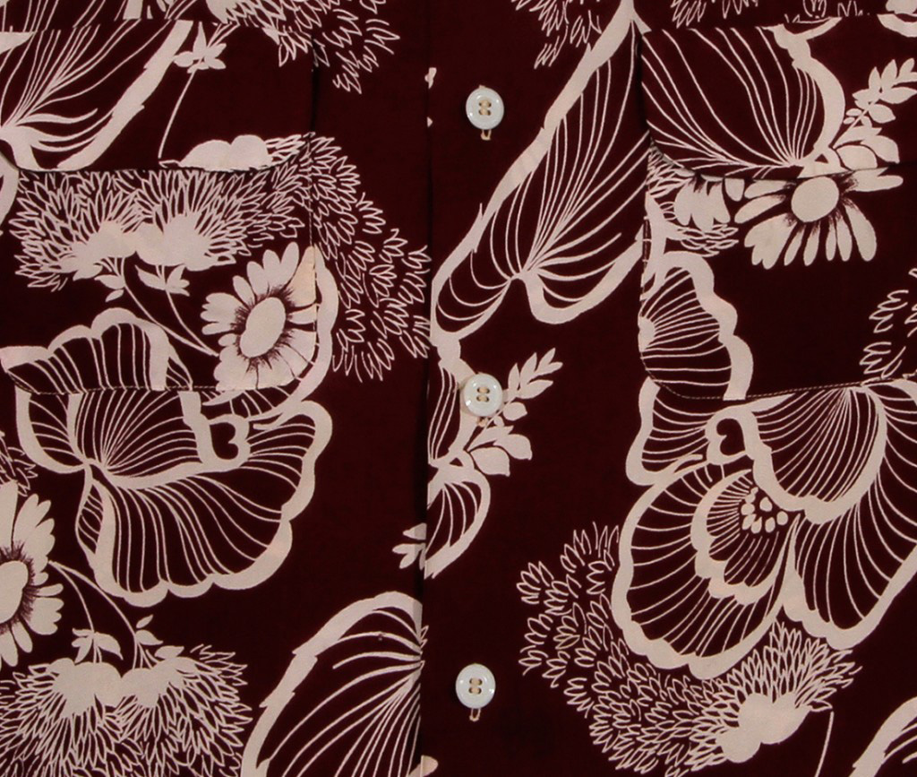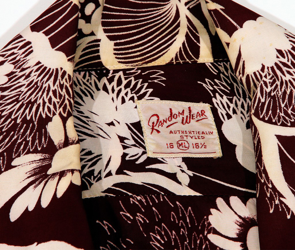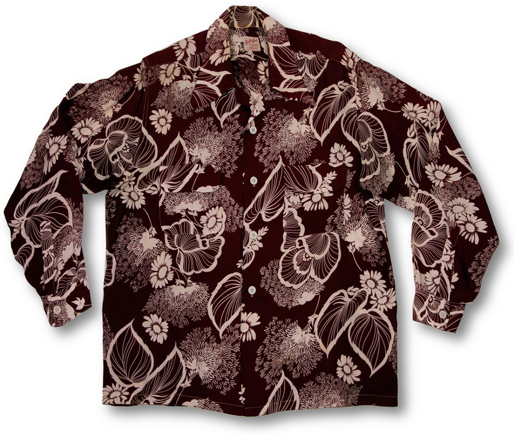A stylish design, this long-sleeved vintage Hawaiian shirt by Random Wear featured one-color motifs of various flowers and leaves that glow against the deep purple fabric. This challenges the notion that aloha shirts are relaxed and casual.