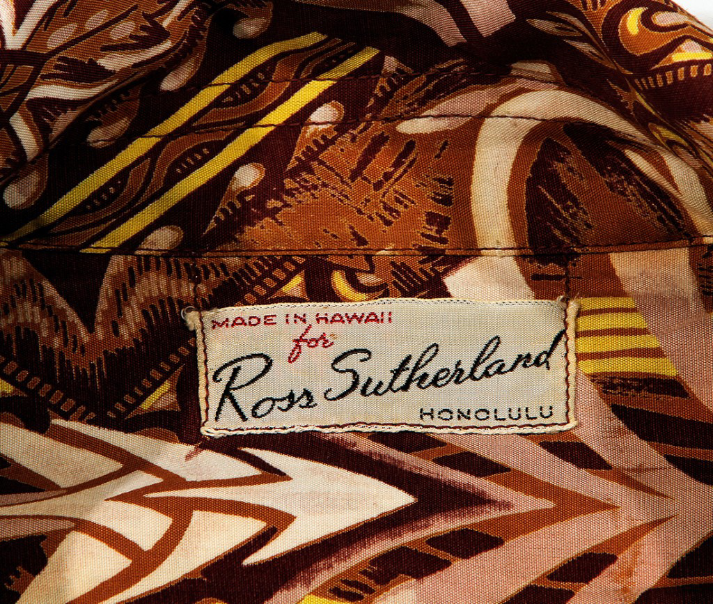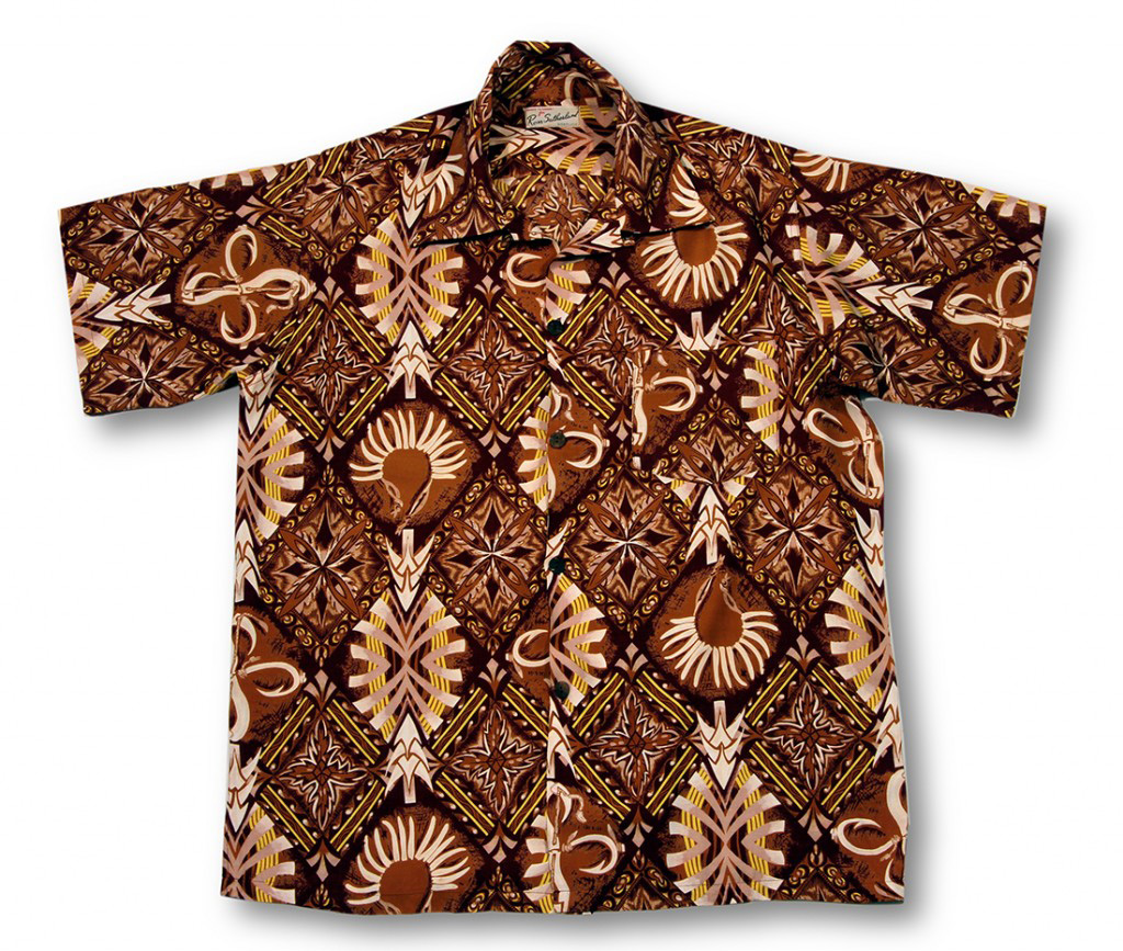 This is an aloha shirt reminiscent of an exhibit at the Bishop Museum. Bone fish hooks, necklaces and spear tips create an interesting design on this Ross Sutherland shirt. The background is traditional brown tapa cloth, giving this shirt a strong Polynesian look and feel.