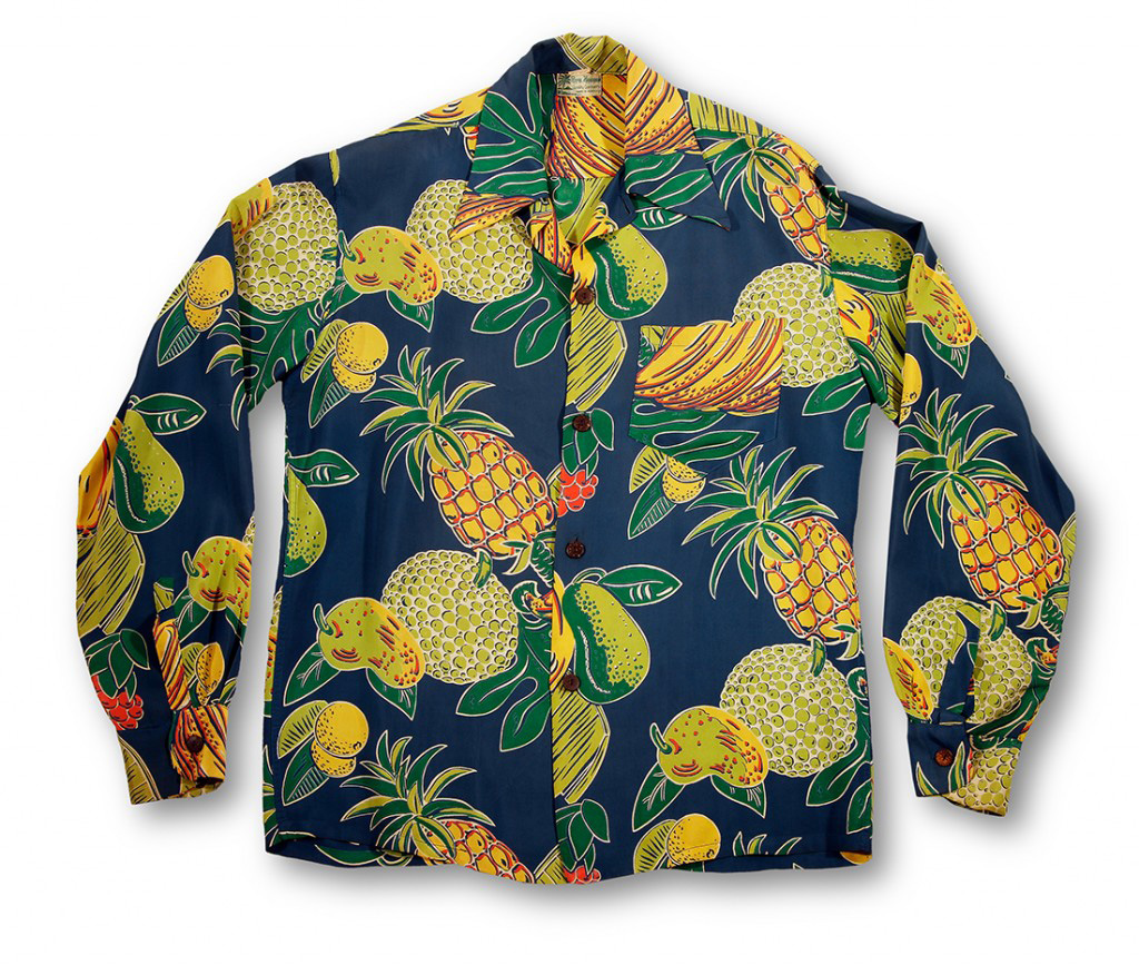The large elements are repeated in a a small fabric repeat on a spacious open ground that allows the fruits to really be appreciated. Rendered by an artist that appreciated fruits grown in paradise with their true shapes and realistic vivid colors. An especially elegant vintage Hawaiian shirt with the added drapey long sleeves.