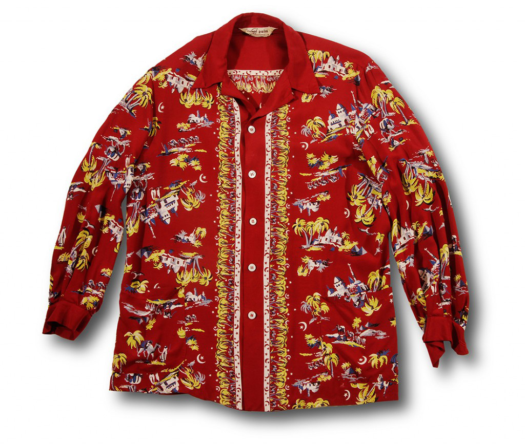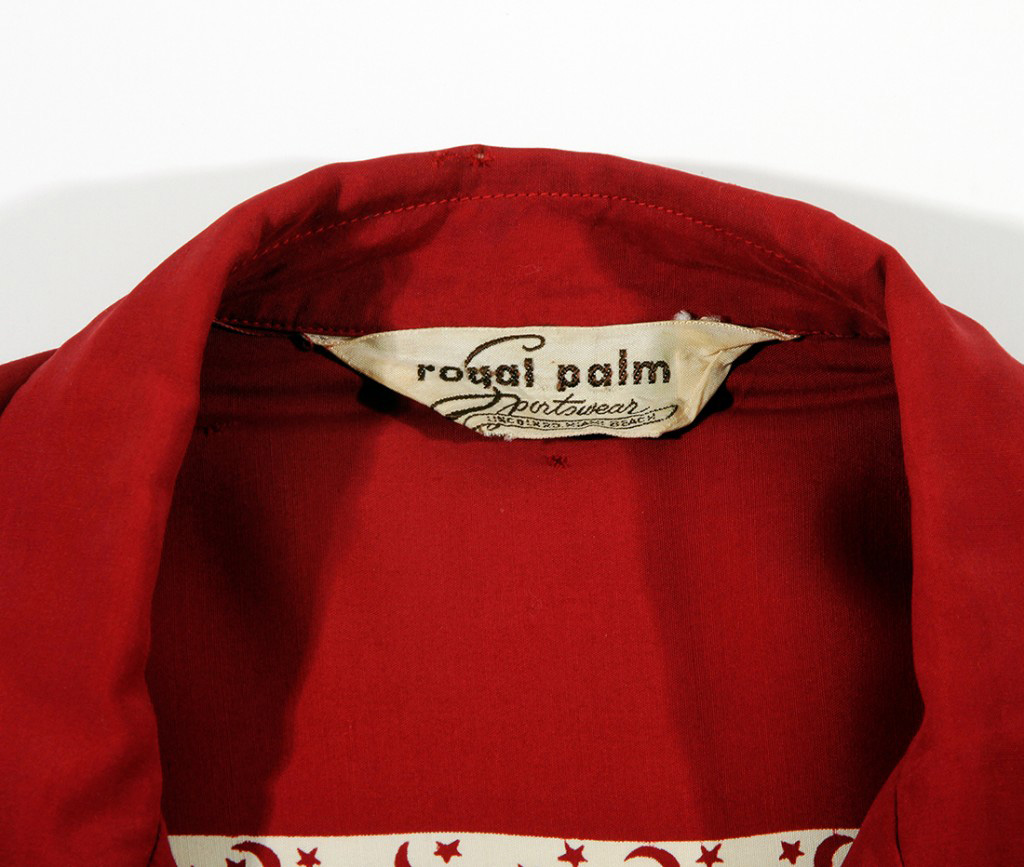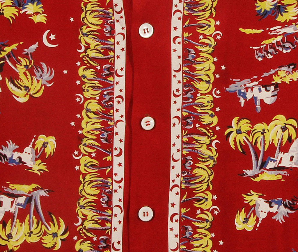 The influence of the Aloha Shirt went around the world to inspire this shirt. Intricately laid out with a well-engineered front of crescent moons and stars with rows of palms giving shade to resting shepherds and their camels. Lone shepherds walk their procession of camels past palms, pyramids, and various larger mosques.