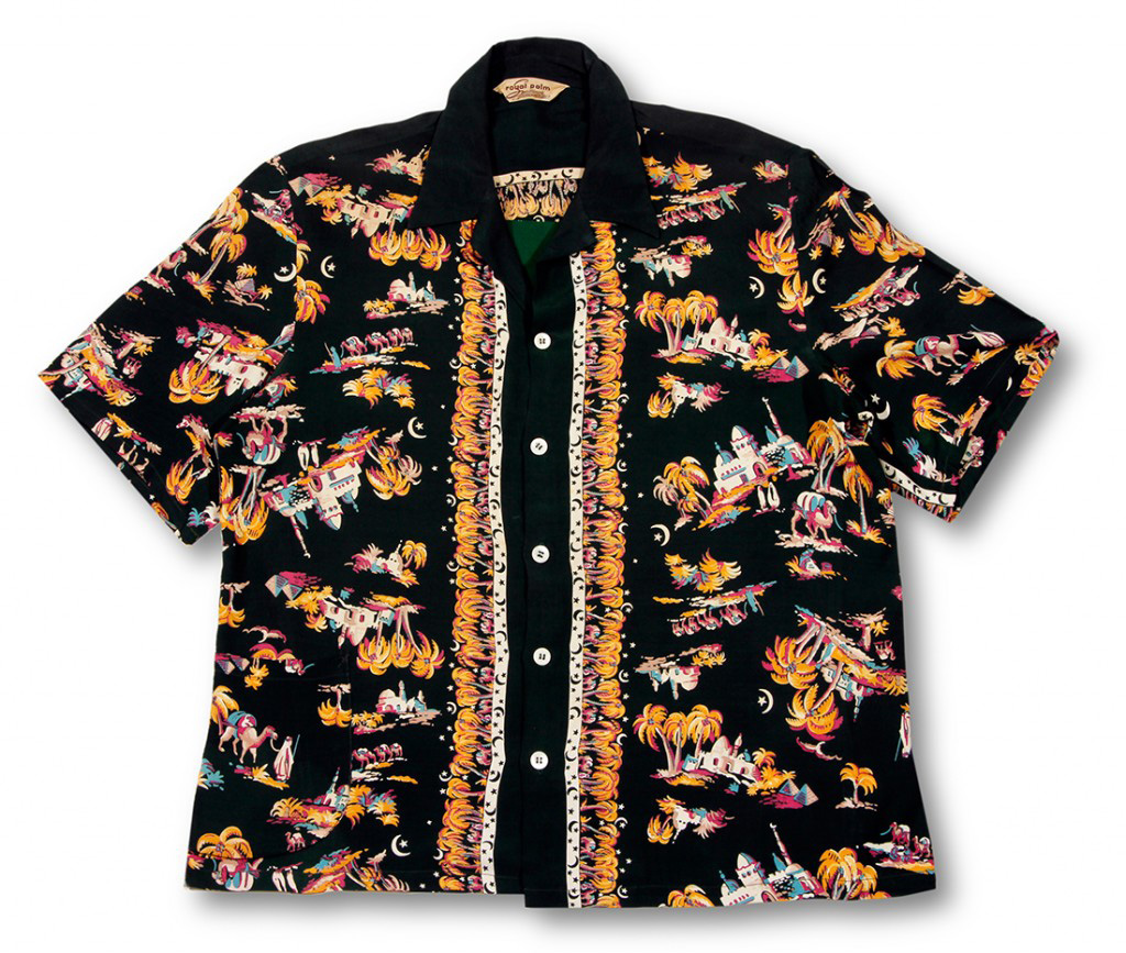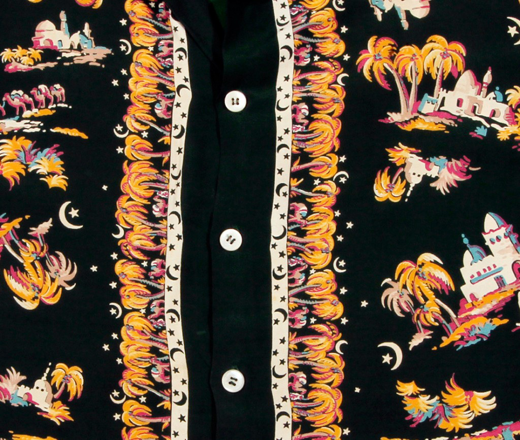 The influence of the Aloha Shirt went around the world to inspire this shirt. Intricately laid out with a well-engineered front of crescent moons and stars with rows of palms giving shade to resting shepherds and their camels. Lone shepherds walk their procession of camels past palms, pyramids, and various larger mosques.