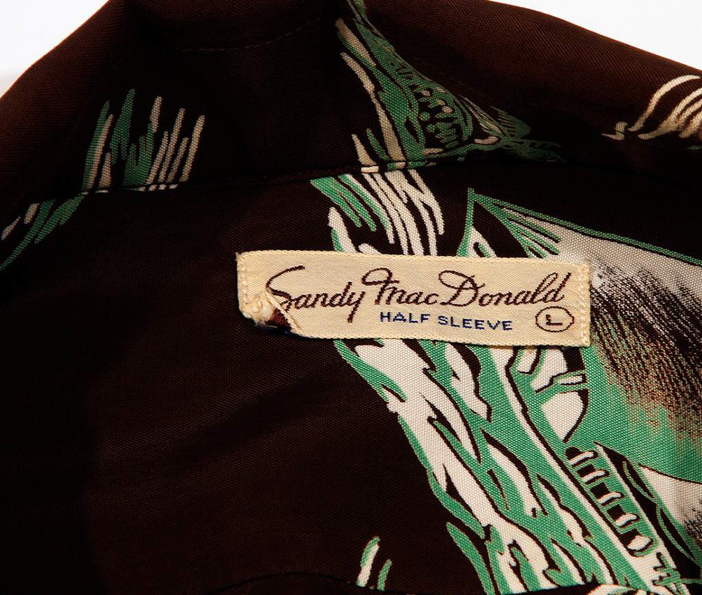 While many of Sandy MacDonald’s vintage Hawaiian shirts included Hawaiian prints in their collections but weren’t especially Hawai‘i-influenced or -inspired, this one is somewhat of a departure. This features sailboats, catching the morning light and sailing across the Pacific, with seabirds in tow. In the distance you can see land, palm trees and all.