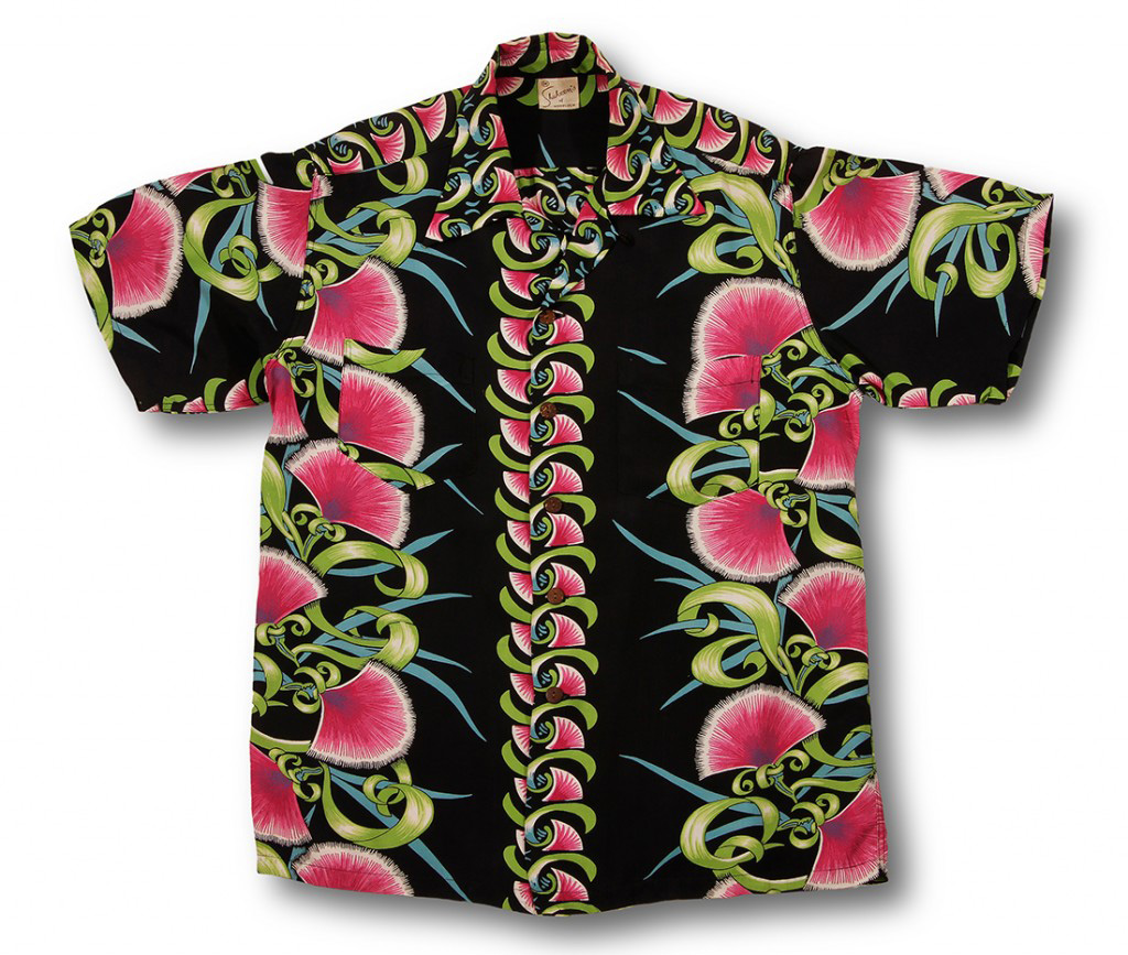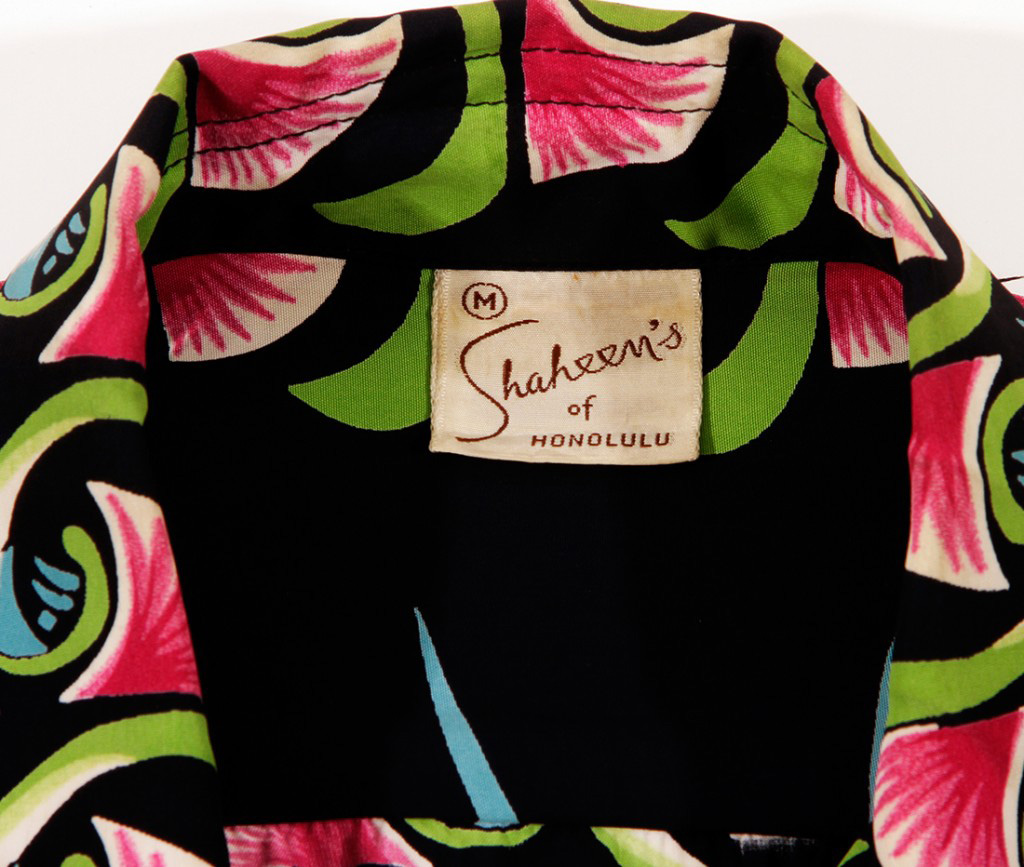 The brilliant designs in bright pink, green and blue on this short-sleeved vintage Hawaiian shirt are distinctive of the quality of craftsmanship by Shaheen’s of Honolulu. Motifs of leaves and flowers run vertical down the front of the shirt. On the sides are pink fan-shaped flowers topping curly leaves in green and blue. These images jump off the black fabric of this high-quality shirt.