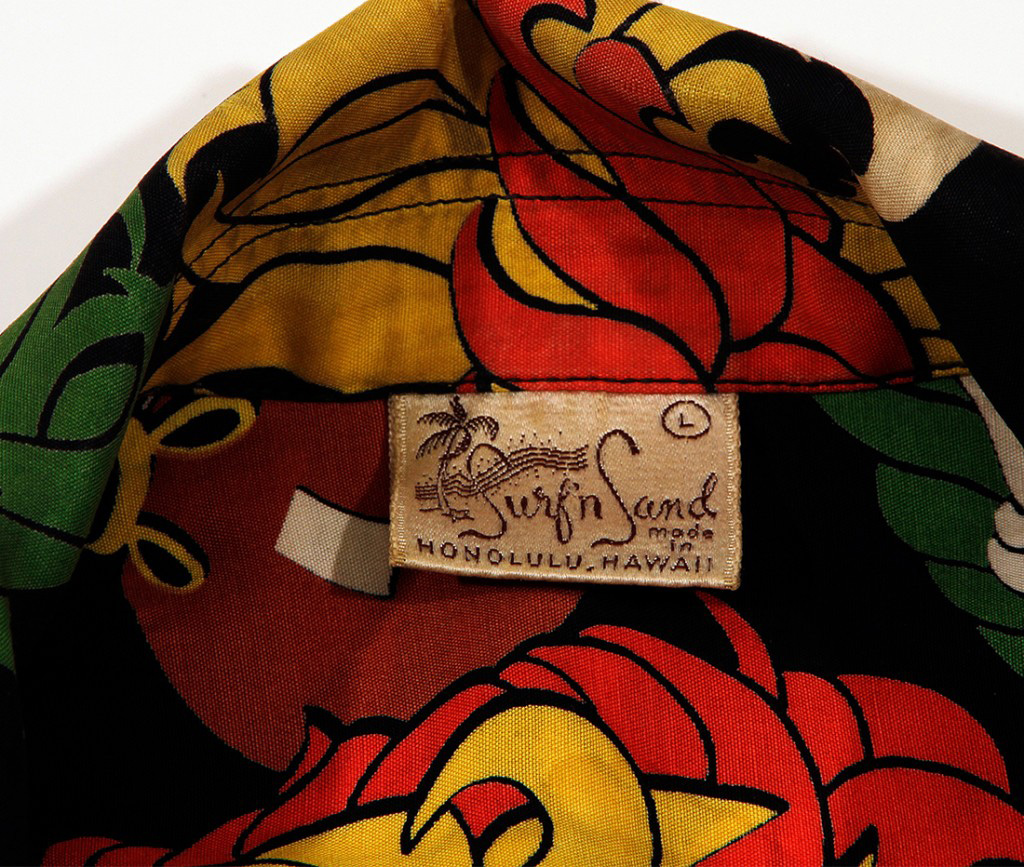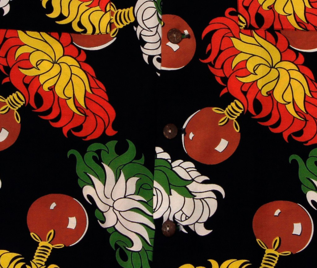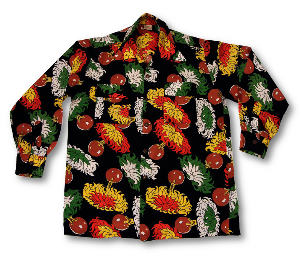 This long-sleeved vintage Hawaiian shirt by Surf n Sand features the ‘ulīʻulī, or gourd rattle containing seeds with colorful feathers at the top. These are used by hula dancers as instruments, either by shaking them or tapping them against the body. The rattles on this shirt have red, yellow, green and white feathers.