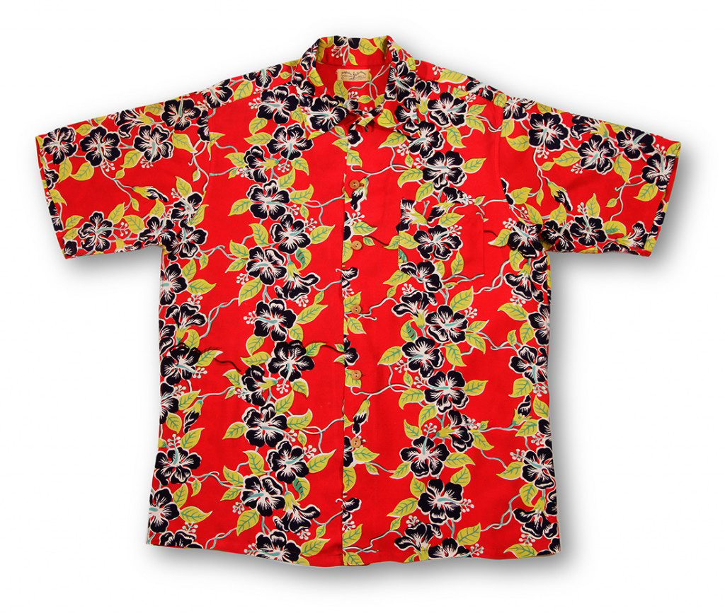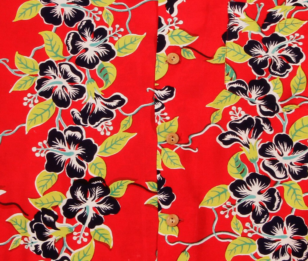 This long-sleeved aloha shirt by Surfriders Sportswear features dark brown hibiscus and bright green leaves, hand-painted in vertical rows on the shirt body and sleeves. The collar has also been carefully planned to show the key hibiscus elements. A turquoise jade colored vine with young buds connects the vertical rows adding more interest to this gorgeous design.