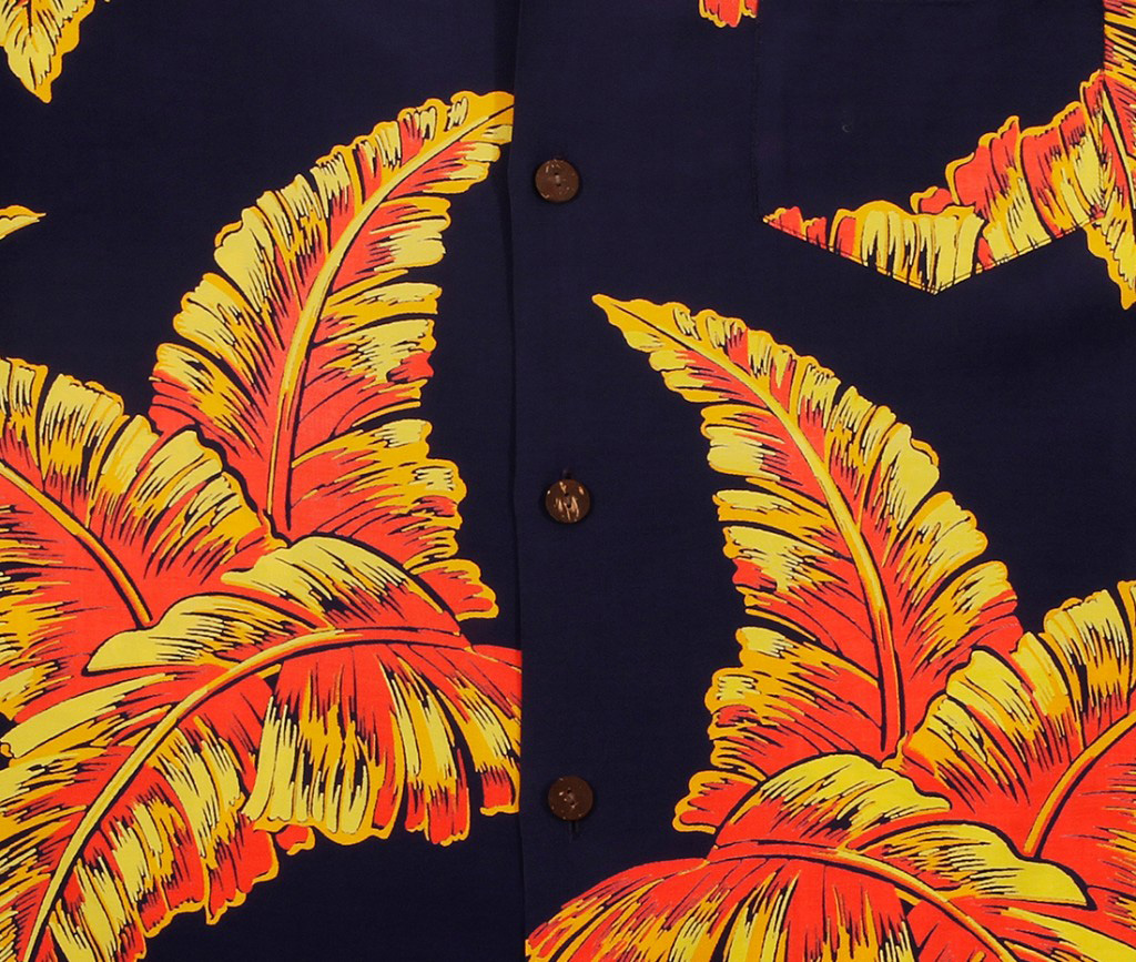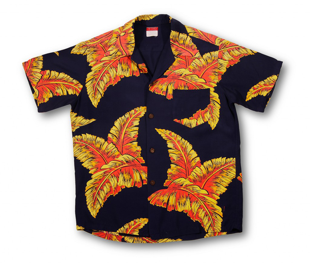 This short-sleeved vintage Hawaiian shirt by The Kahala features a criss-cross of large, hand-painted red and gold palm leaves that shine against the black fabric. The sheen gives these leaves a sunlit feel and makes this shirt dressy enough for an evening wedding in Waikīkī.