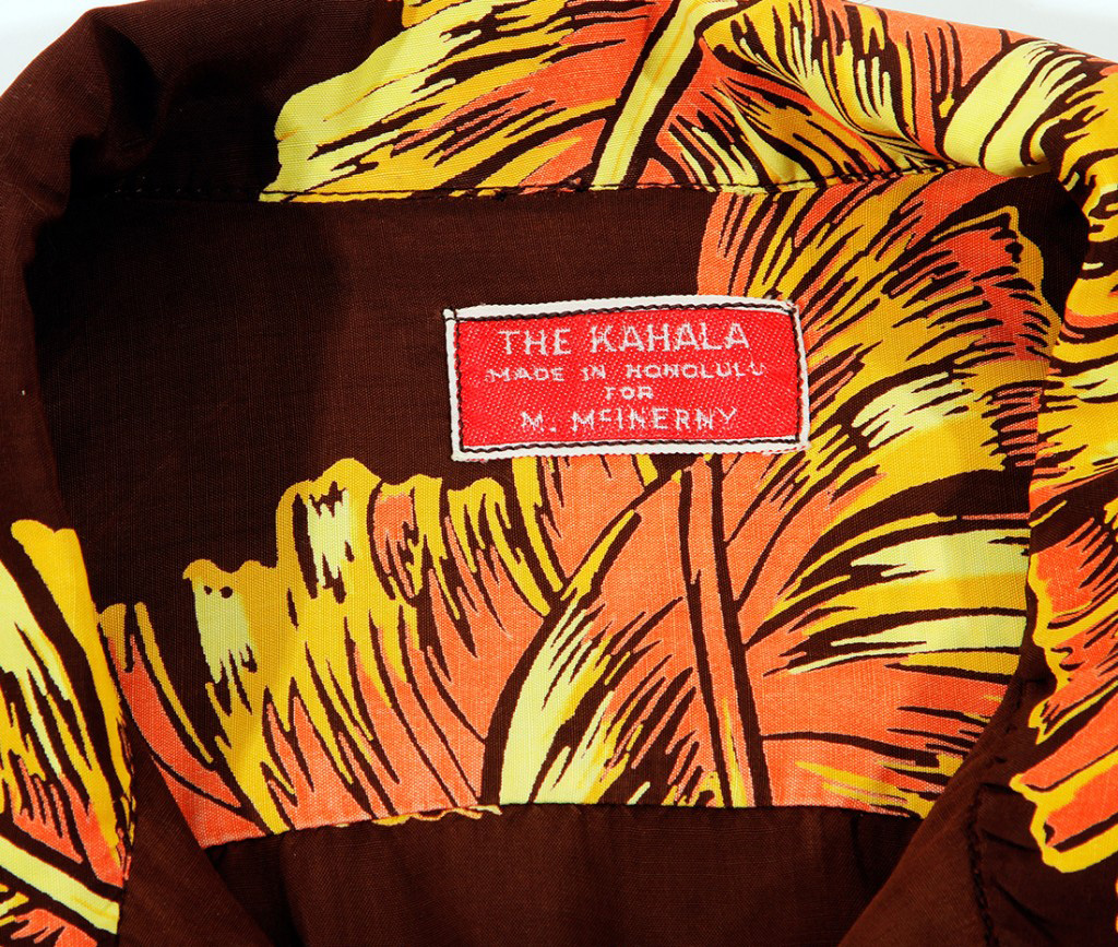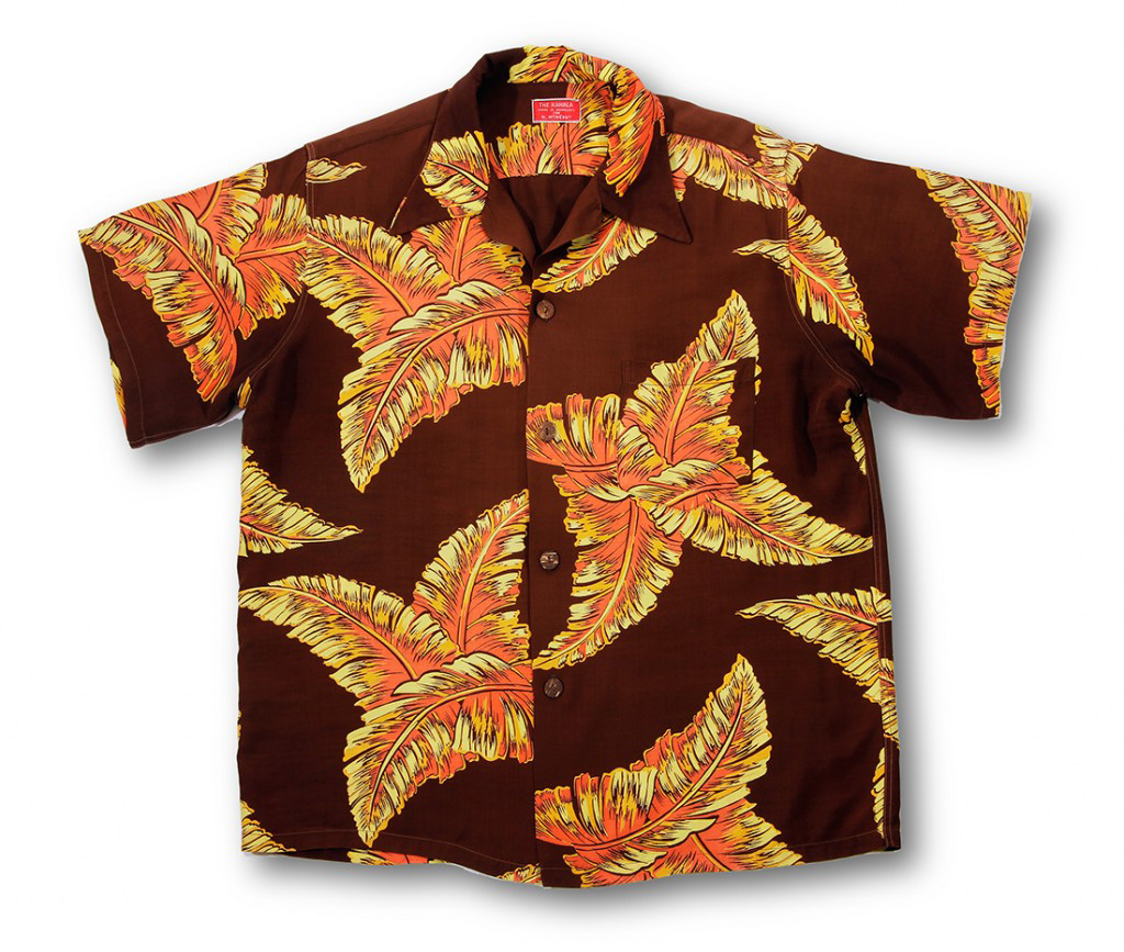 This short-sleeved aloha shirt by The Kahala features a criss-cross of large, hand-painted golden palm leaves that shine against the dark brown of the fabric. The sheen gives these leaves a sunlit feel and makes this shirt dressy enough for an evening wedding in Waikīkī.