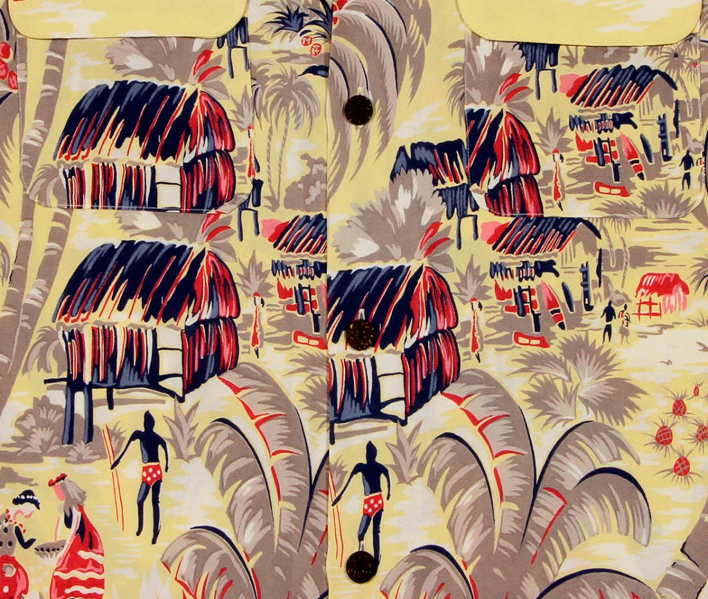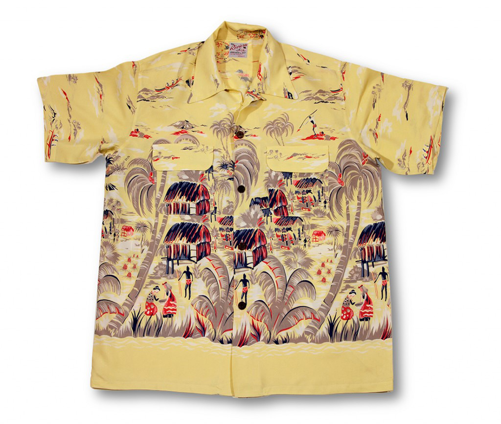 The Cisco Duke Kahanamoku brand created a large collection of rayon shirts in the 1950’s. This vintage Hawaiian shirt print is similar to one of their original designs. It is our belief that Riviera was inspired by the original Duke’s shirt and created a similar version. There are flaps on the two chest pockets and coconut buttons, both of which were not found on Duke’s shirts by Cisco.