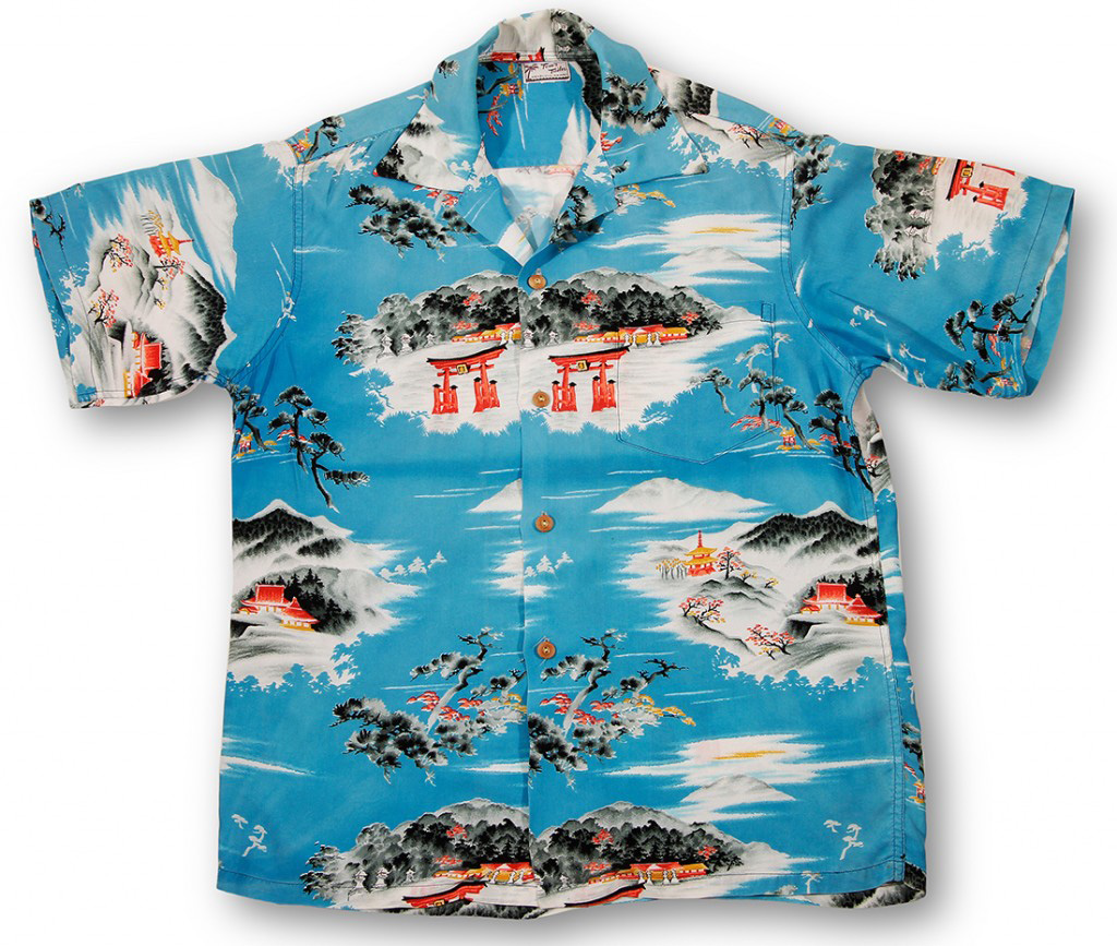 This short-sleeved vintage Hawaiian shirt by Tom’s Tailor is a nod to the Asian-inspired designs popular in the ’60s. Red torii (traditional Japanese gates) mark the entrance to red-roofed temples in a mountain setting. It’s cold, there’s still snow on the ground, and the icy blue shirt conveys that chill.