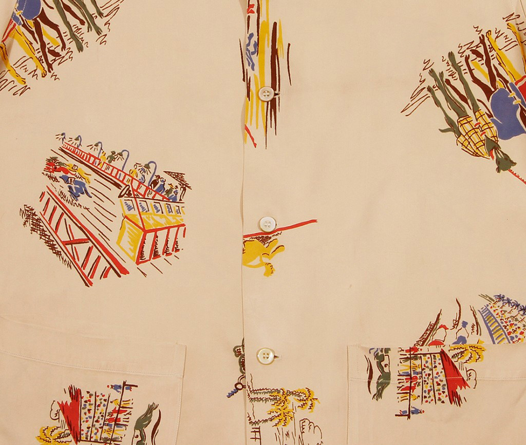 This beige short-sleeved aloha shirt features hand-drawn scenes from a greyhound race, a competitive event where dogs chase a lure — typically an artificial hare or rabbit — around a track until they cross a finish line. The race track stadium is filled with spectators, cheering on their favorite dog. And a trio of greyhounds, wearing jerseys, stand in a row. On the collar are red and yellow rabbits, which the dogs chase.