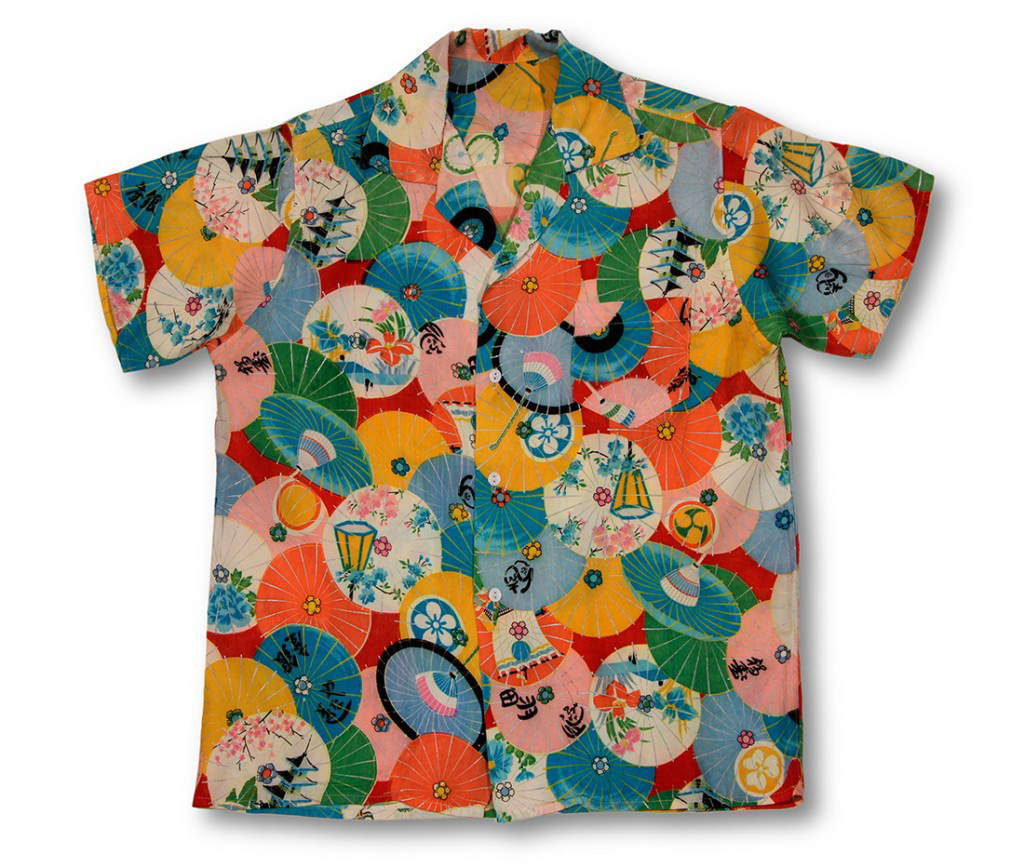 This vibrant Asian-inspired short-sleeved aloha shirt features popular symbols in Japanese culture like fans, drums, sakura (cherry blossoms), pagodas and colorful irises. The background of the shirt is an array of umbrellas in different hues, from blue to orange to gold. Scattered throughout are mon, or emblems, used to decorate and identify an individual or family like European coats of arms. These crests typically consist of a circle with a figure of a plant, animal, natural, geometric or celestial object in it.