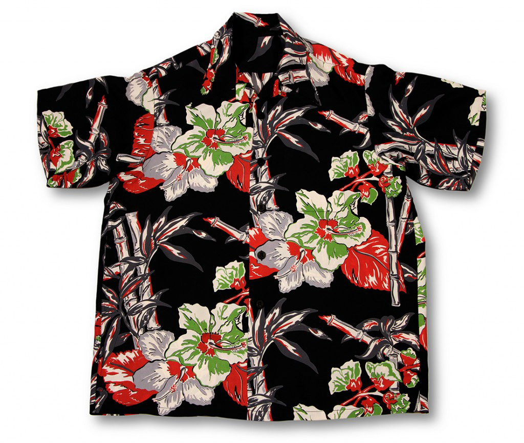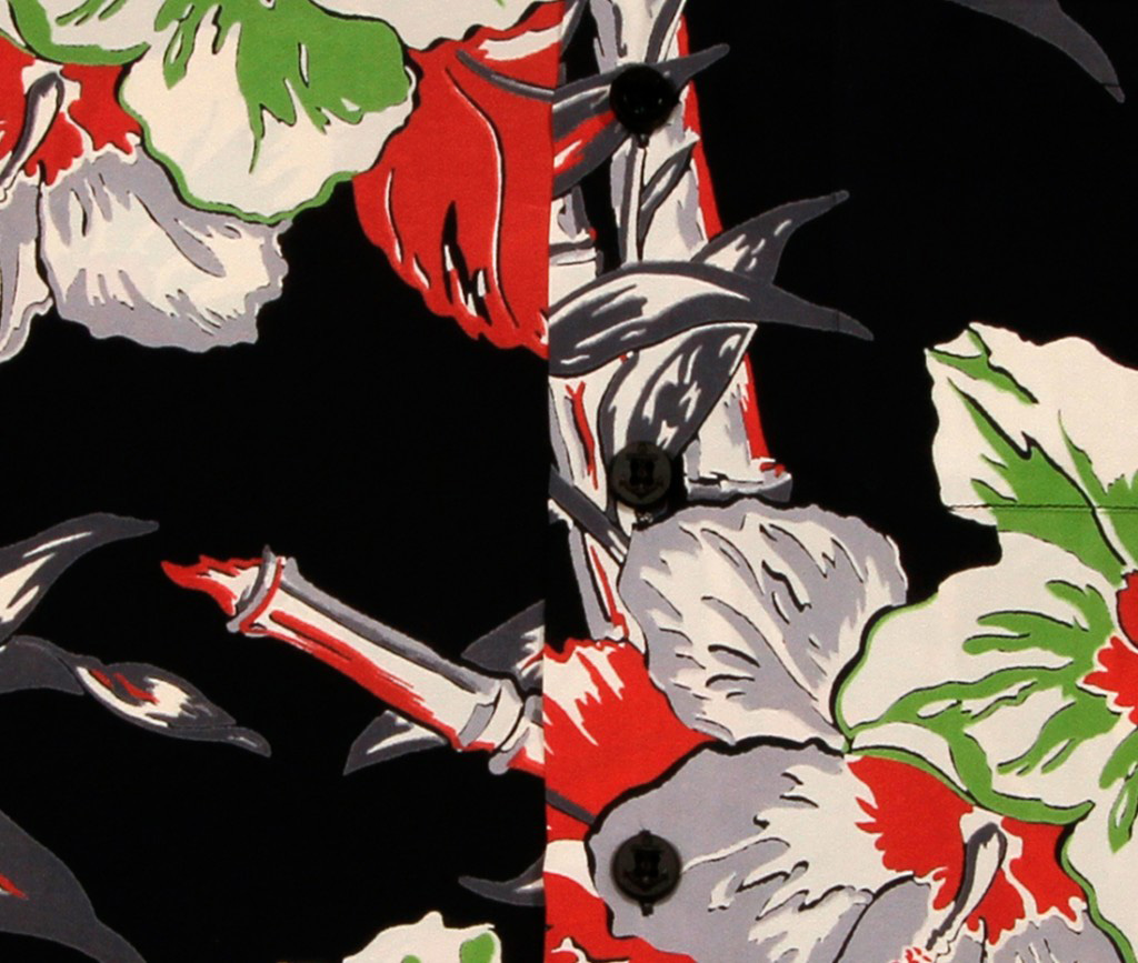 This short-sleeved vintage hawaiian shirt features an artistic rendering of the hibiscus, the official state flower. The large red, gray, and green-tinged white flowers pop off the black fabric of the shirt. Gray and red bamboo stalks and leaves connect the hibiscus, in an east-meet-west feel.