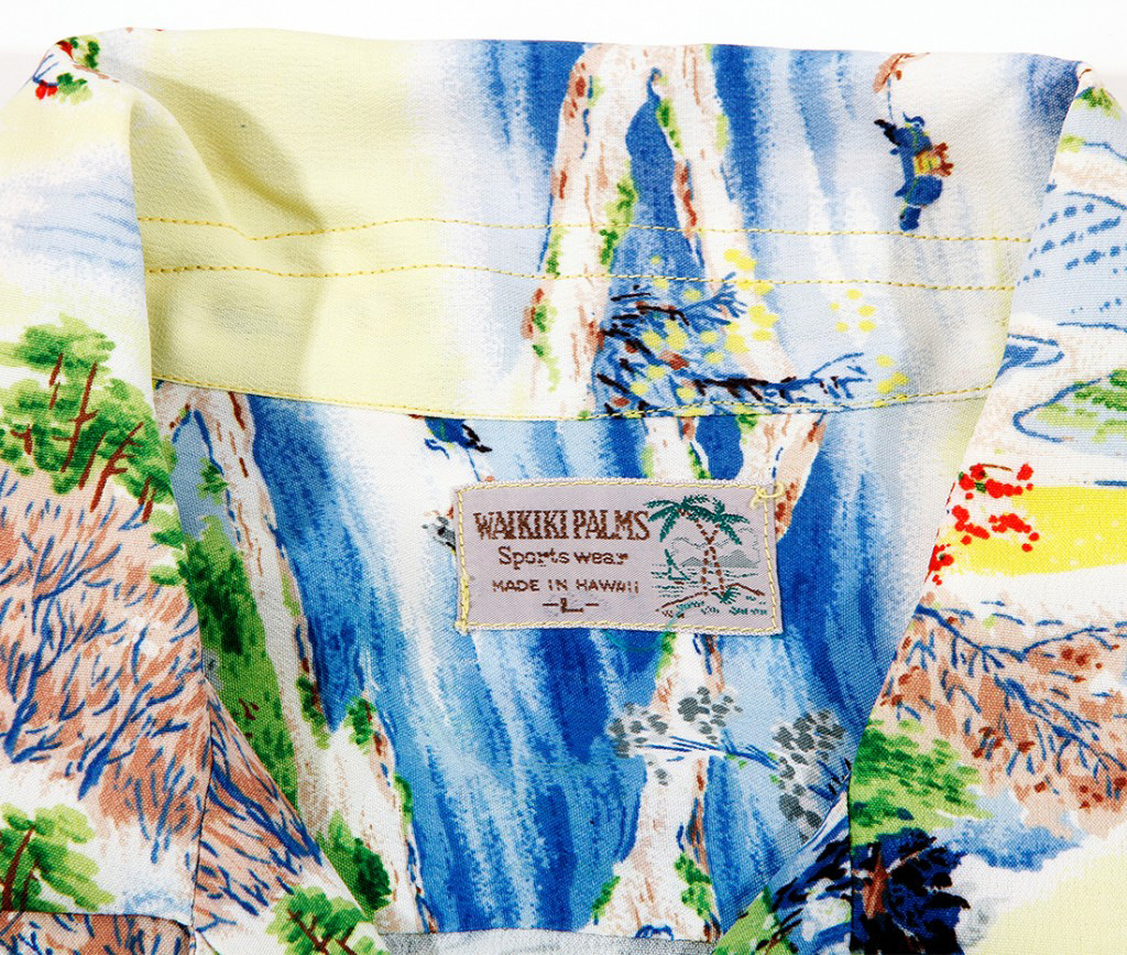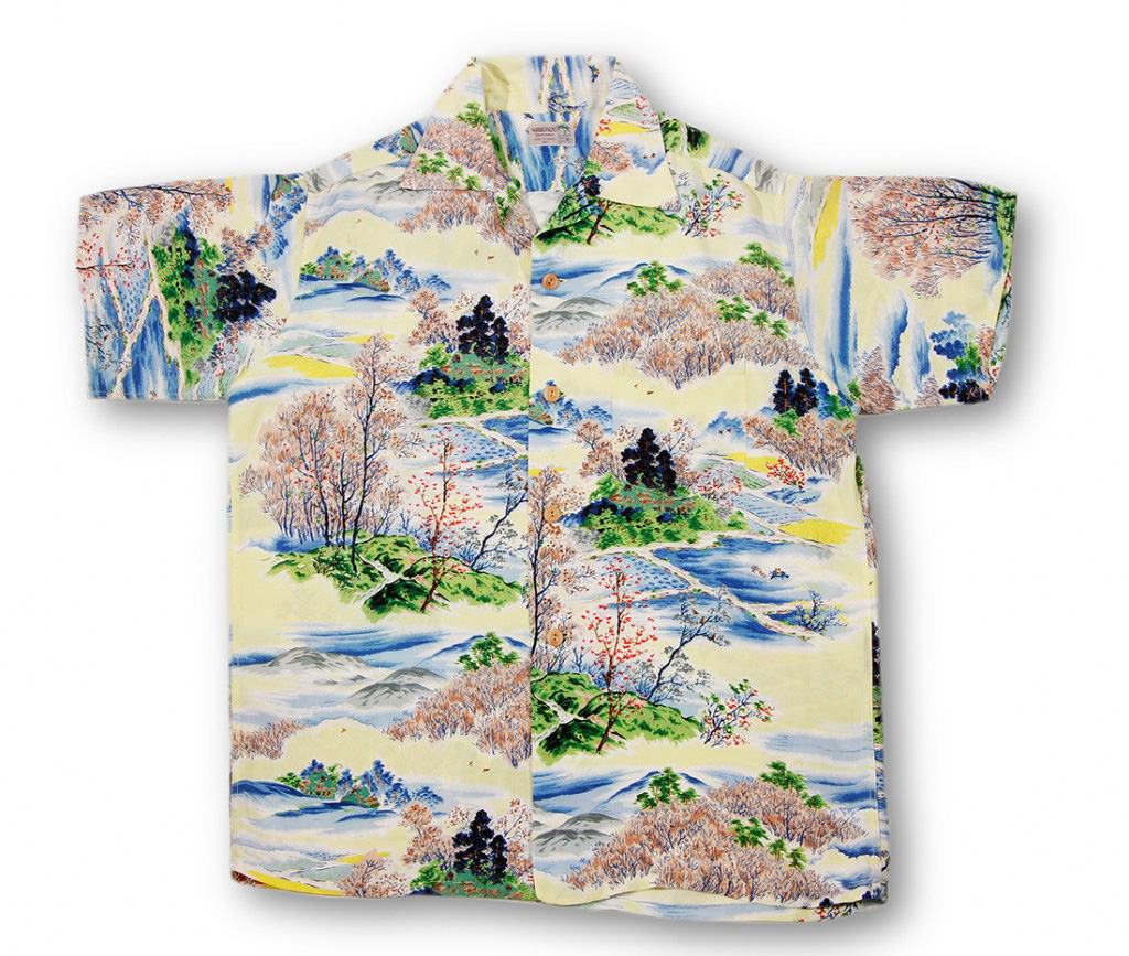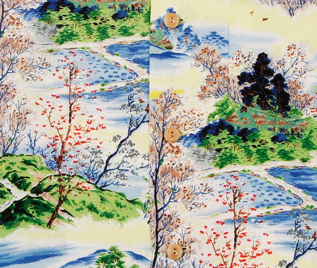 This short-sleeved aloha shirt by Waikiki Palms features a serene landscape in the late autumn months. The trees are holding onto their last wisps of red leaves, the mountains are gray and ready for snow. The blue and light yellow give this landscape a chilly feel to it. Winter is coming.