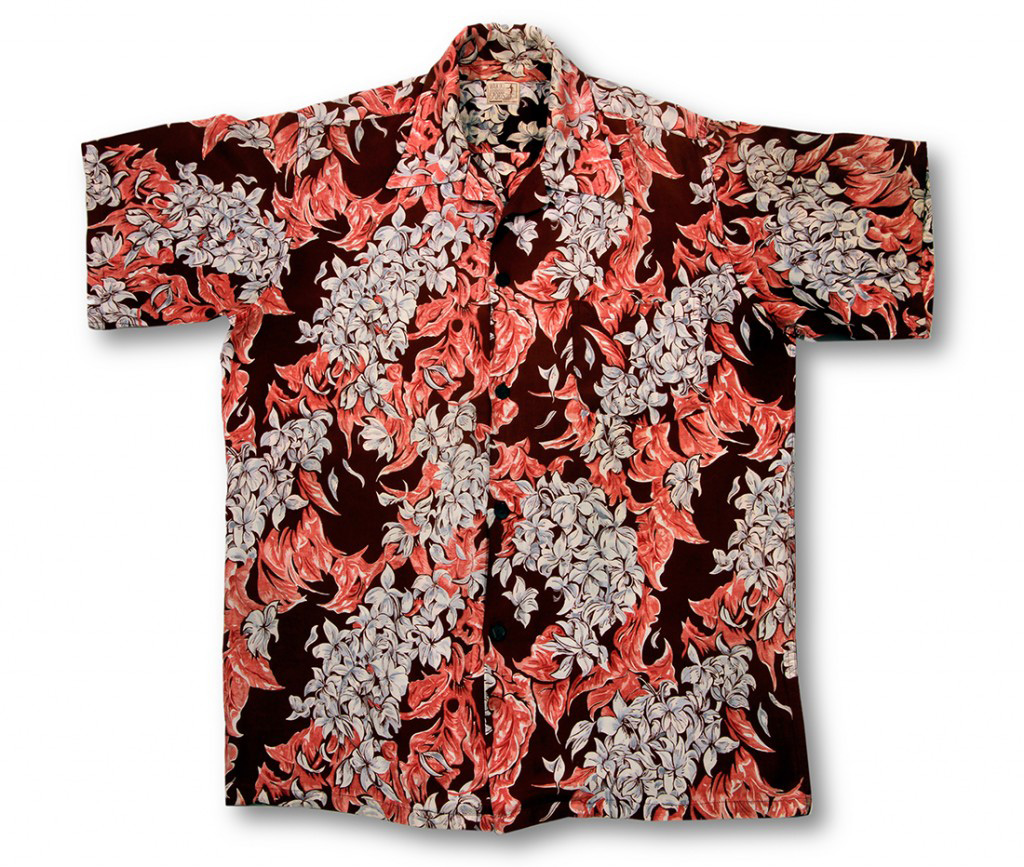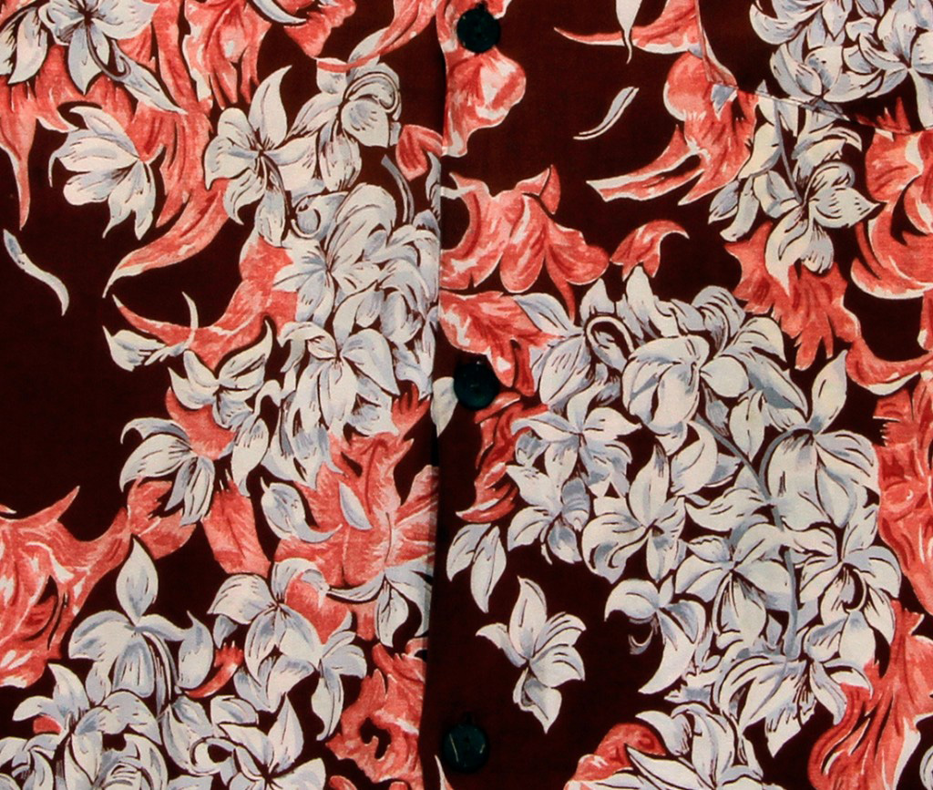 The clusters of flowers and leaves on this short-sleeved aloha shirt by Waikiki Sports creates a stunning visual. The flowers have a grayish tone that are accented by the orange leaves and dark fabric of the shirt.