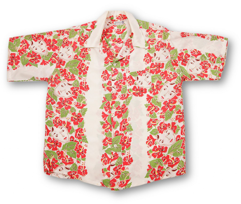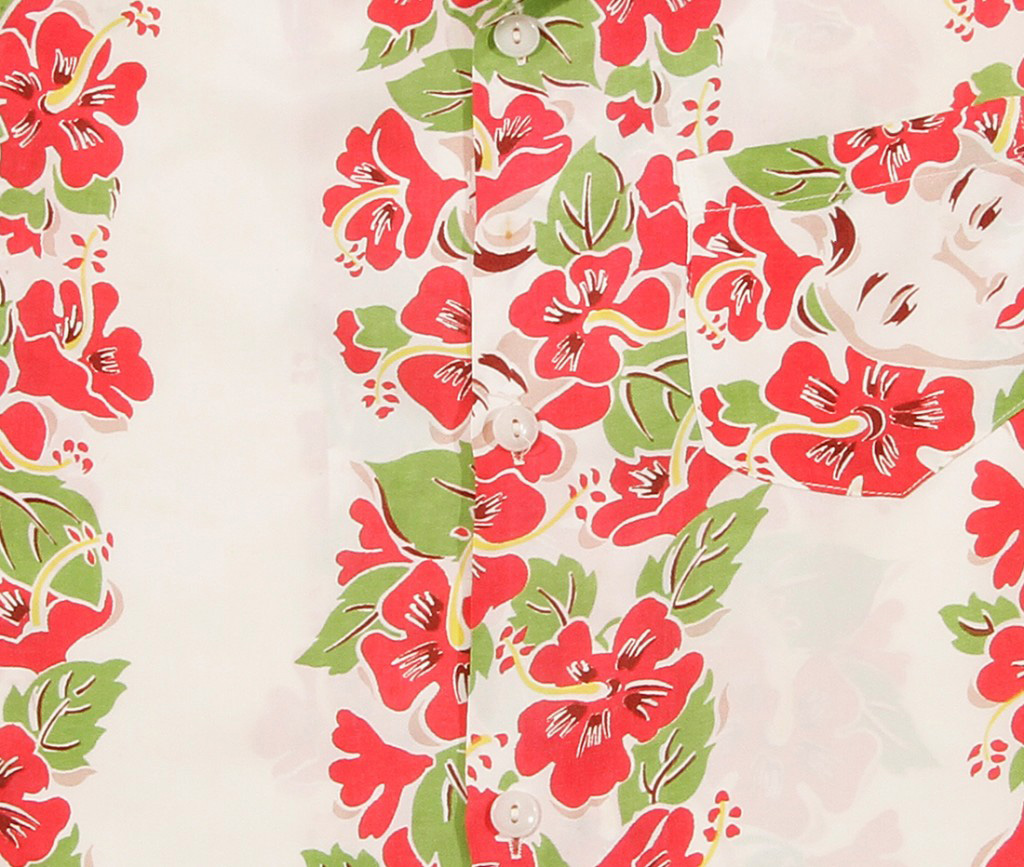 On this short-sleeved Watumull’s & Leilani aloha shirt, you’ll find a woman’s serene face surrounded by bright red hibiscus and green leaves, situated vertically down the body and sleeves of the shirt as if placed as lei. The way her face peeks out is both haunting and alluring, making for an interesting pattern on this shirt.