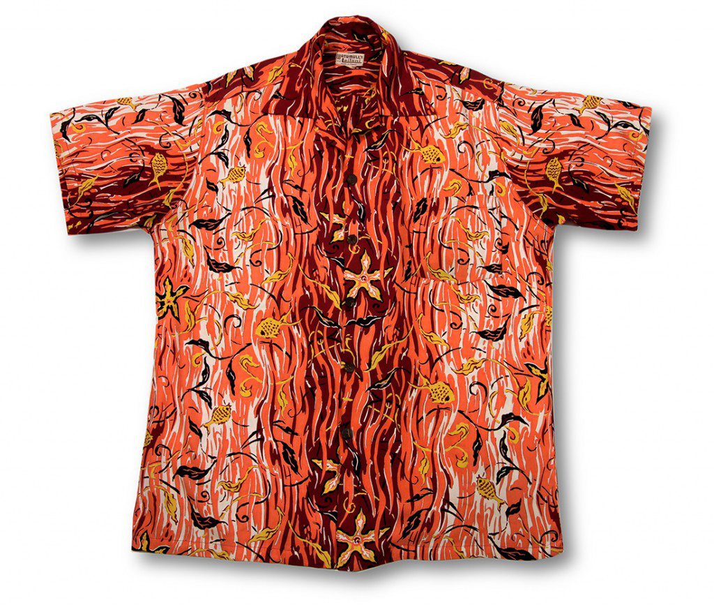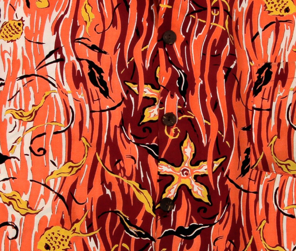 Get caught up in this fish net full of small fish, starfish and limu (seaweed) on this short-sleeved shirt by Watumull’s & Leilani. The swirls of white, orange and dark red that make up the background pattern of this shirt suggest the movement of the ocean at sunset.