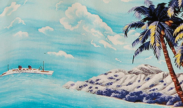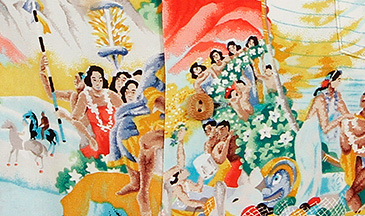 Iolani started as a small company with four employees and the vision of Keiji and Edith Kawakami. They originally focused on men's shirts, using silk, rayon and lovely Kabe crepe fabric imported directly from Kyoto, Japan. Many of the fabrics they imported had fresh designs with village prints, surfing, canoes, Diamond Head and the scenic Waimea Canyon on Kauai. Generally hand screened, their prints were colorful and carefully hand rendered representations of relaxed Island scenes.